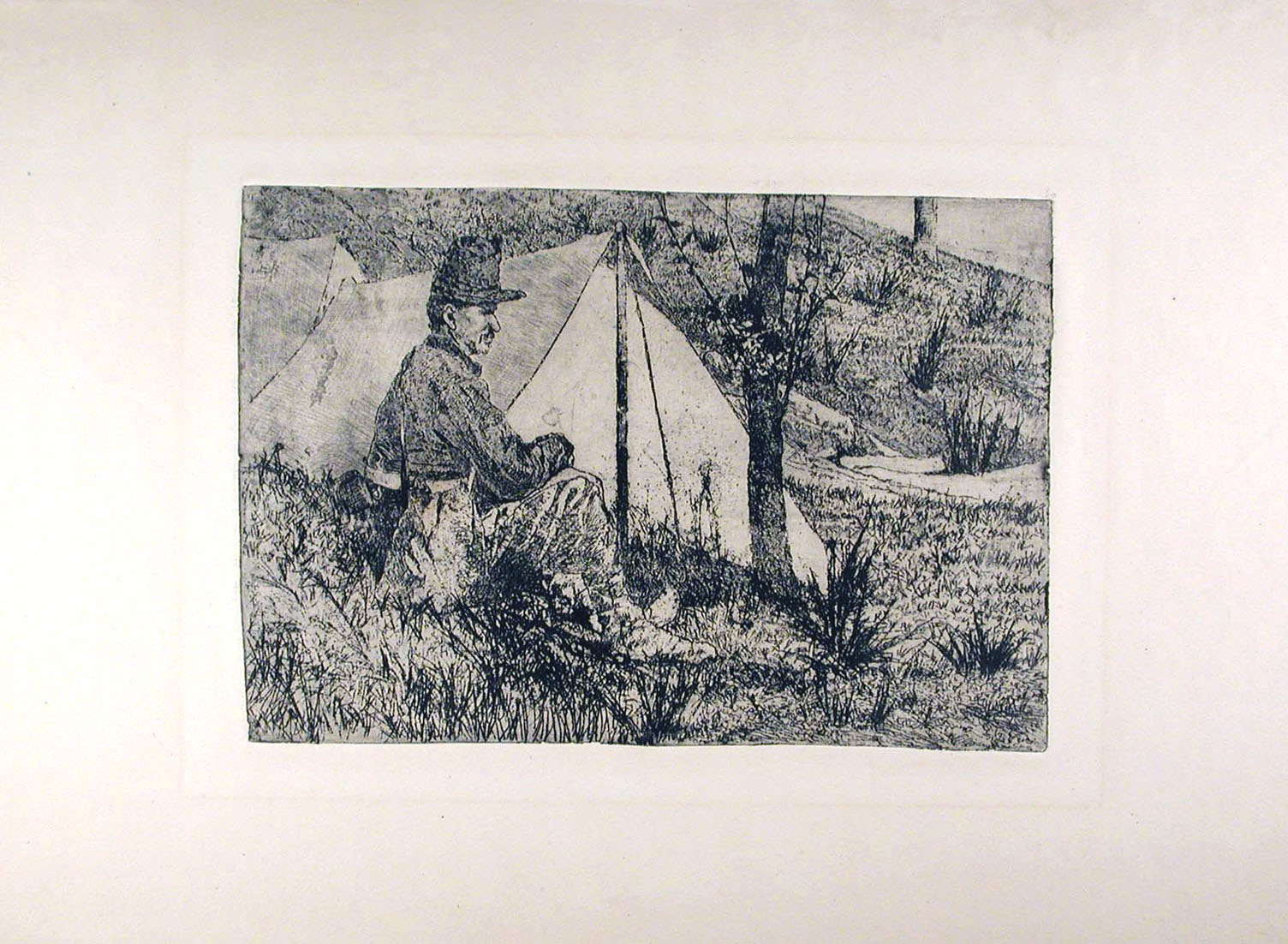 Zinc etching, Baboni-Malesci CLVI. A fine impression, printed on wove ivory paper with the watermark P.M.P. With wide margins; lightly foxed, generally in very good condition. Inscribed in pencil on the verso, by Andrea Baboni, ACCAMPAMENTO, bellissima acquaforte su zinco di / Giovanni Fattori (BABONI-MALESCI Tav. CLVI); / interessante prova facente parte di una rara tiratura / coeva all'Autore eseguita intorno al 1900. / Andrea Baboni 8 - VI - 1984. To the platemark 191 x 278 mm, the entire sheet measuring 350 x 470 mm.