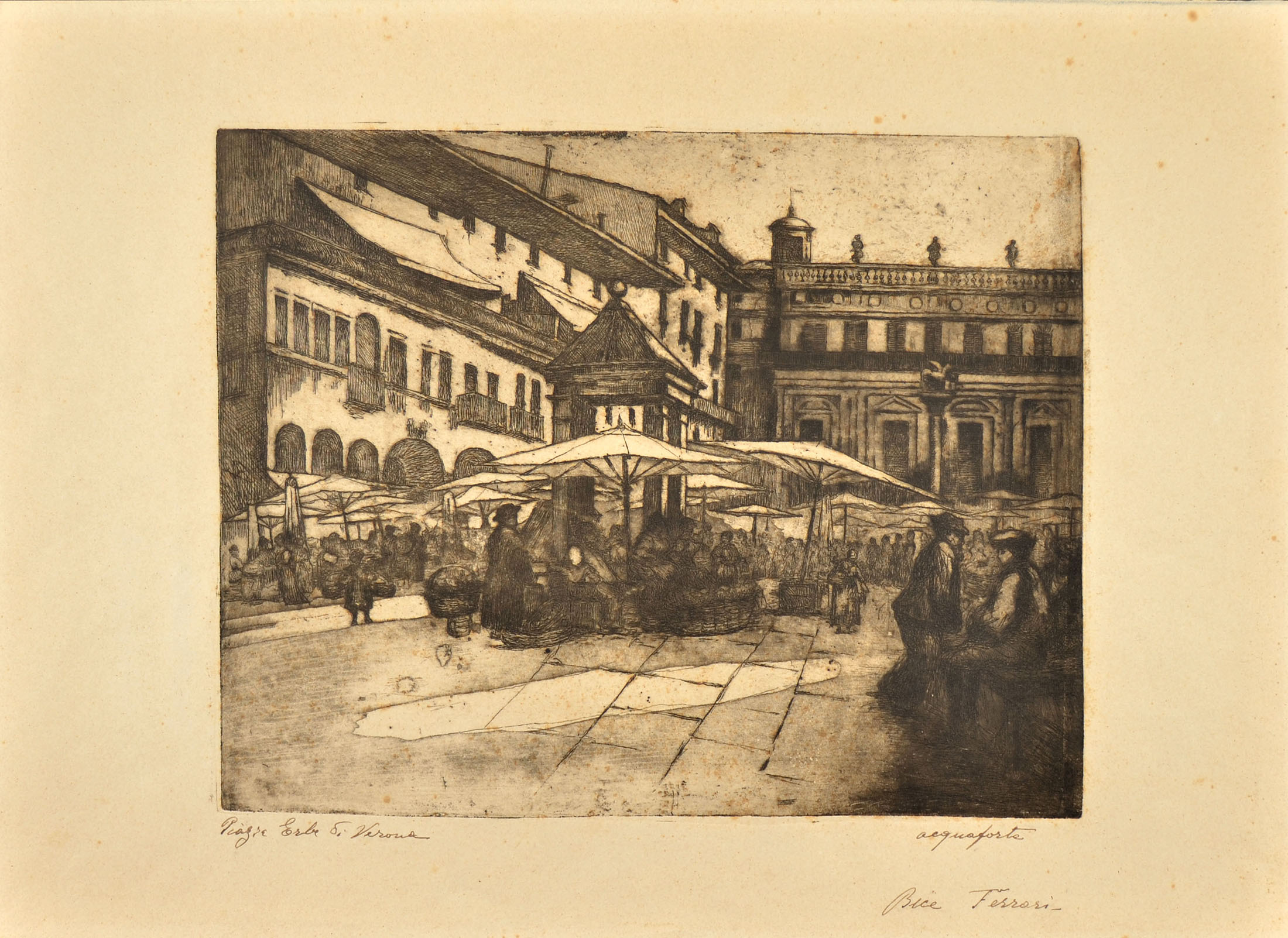 Etching. Titled and signed in pen at bottom margin Piazza Erbe di Verona / acquaforte / Bice Ferrari. Fine impression, with large margins, in very good condition. To the platemark 230 x 292 mm.