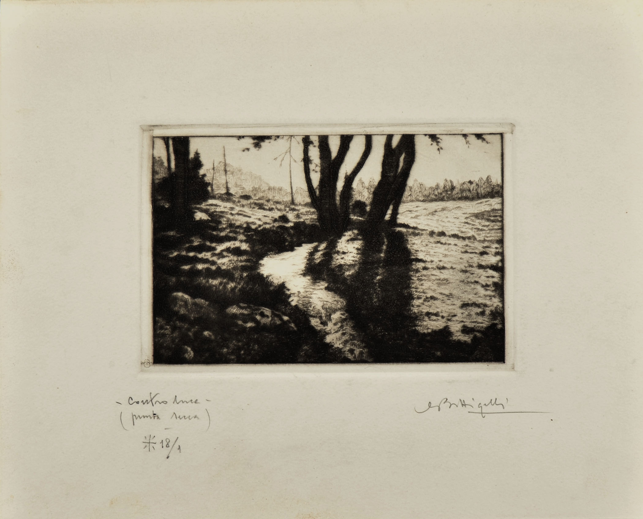 Drypoint. Titled, inscribed, numbered and signed in pencil bottom margin - Contro luce - (punta secca) * 18/1 MBattigelli.