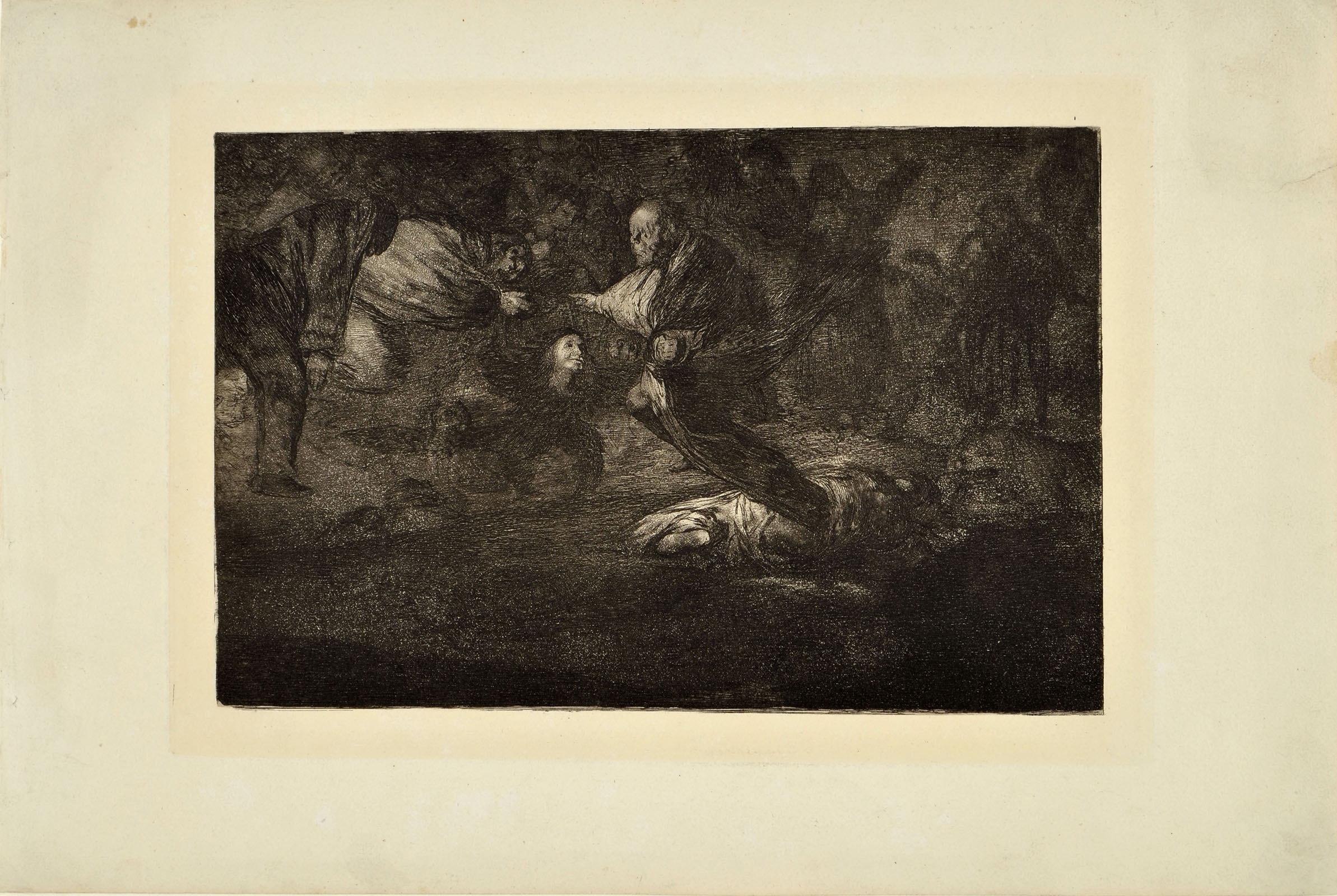 Etching and burnished aquatint, plate 18 from Los Proverbios (c.1816-1824); Harris 265, III, 1. A fine impression from the first edition (1864), limited to 300 copies, printed in black ink on heavy wove paper. With margins, binding traces on the left margin and a minor tear restored on the right margin; otherwise in very good condition. To the platemark 245 x 350 mm, the entire sheet measuring 325 x 490 mm.