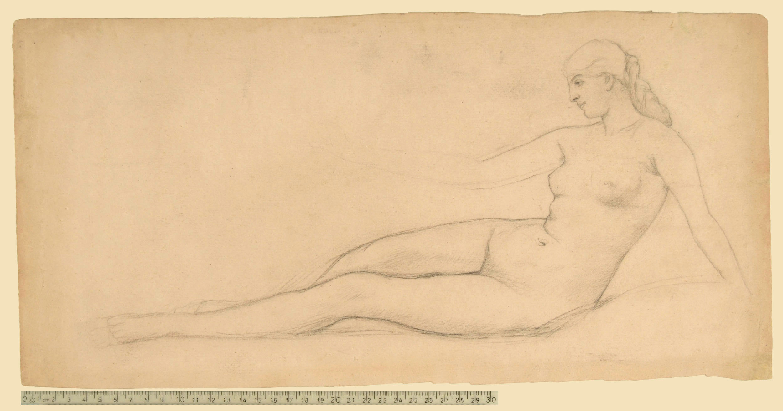 Black chalk, on wove beige paper; 240 x 490 mm. On the verso a standing female nude.
