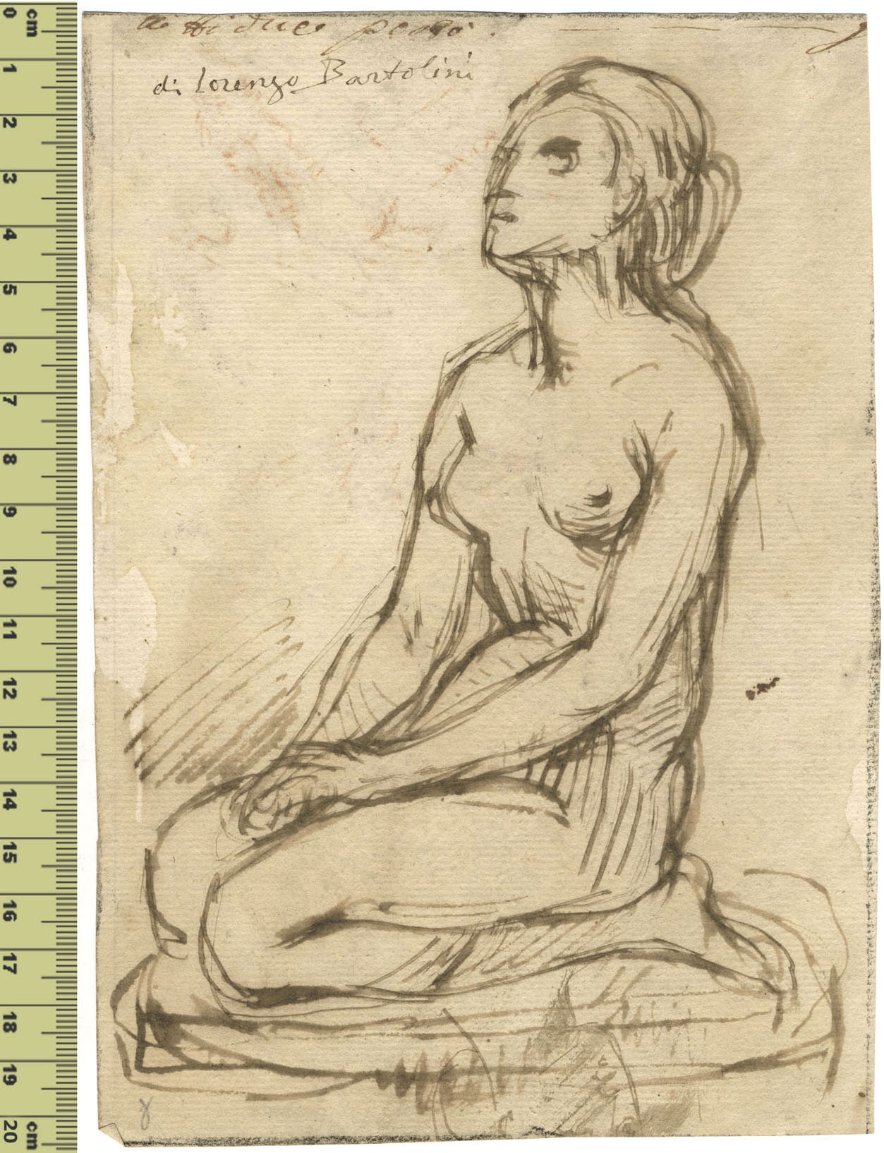 Pen and brown ink, on laid paper lightly washed in brown. Inscribed in pen di Lorenzo Bartolini. On the verso sketches of figures in black chalk. 204 x 140 mm.