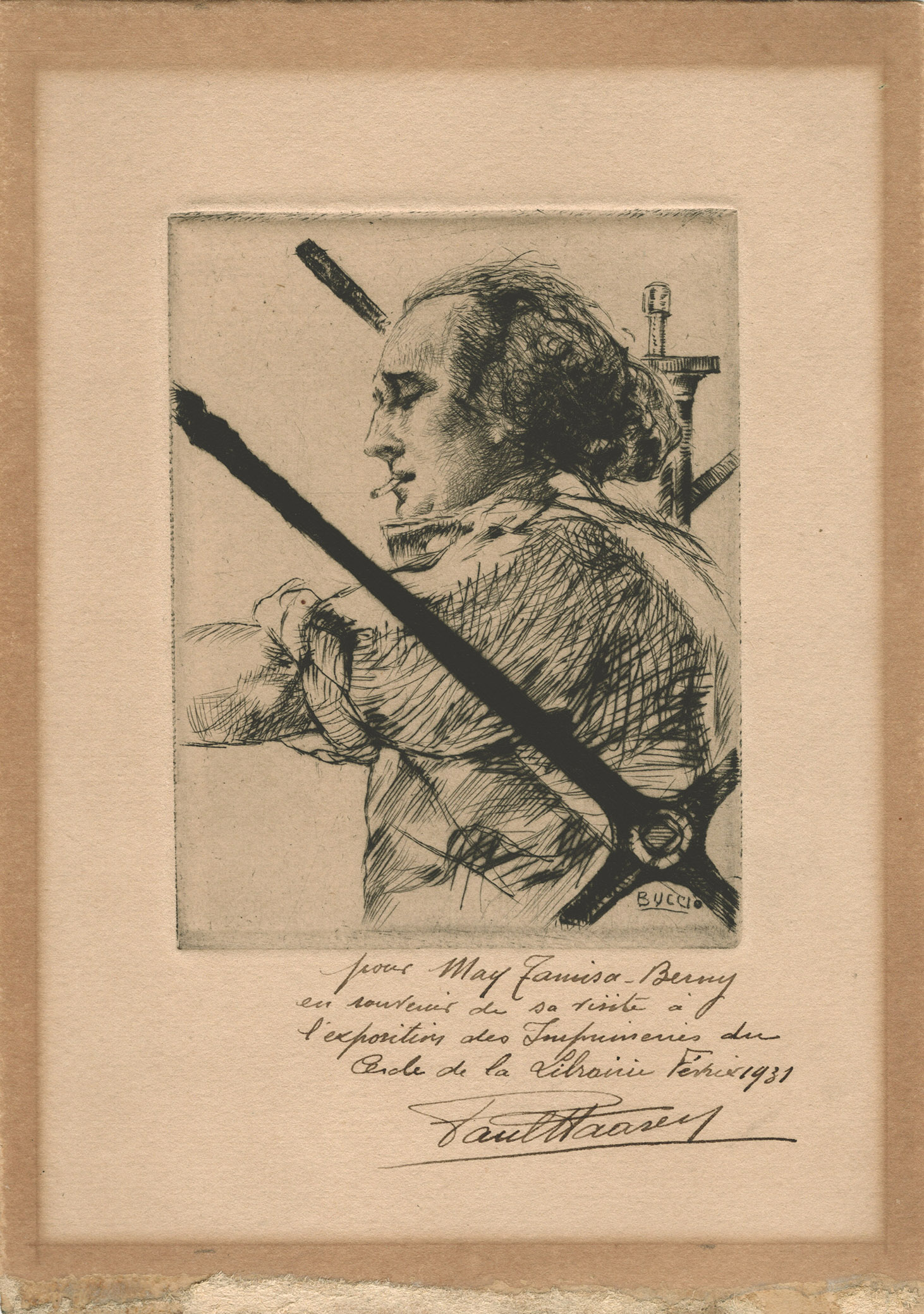 Drypoint, 98 x 75 mm. Signed Bucci in the plate. A fine impression, printed on cardboard and dedicated by Haasen in 1931. Toned, the entire sheet measuring 177 x 126 mm. Another impression of this rare print is preserved in Milan at the Civica Raccolta delle Stampe Achille Bertarelli.