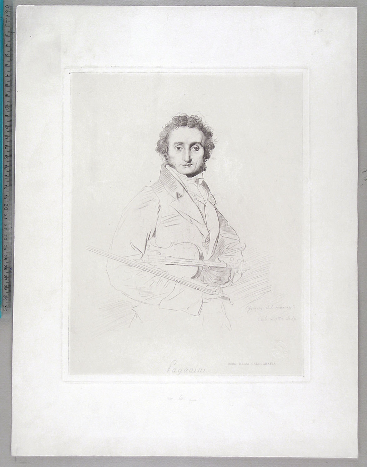 Engraving, after Ingres. A very good posthumous impression of the final state, with the address of the Regia Calcografia, Rome, and its blind stamp, which has been used until 1947. Printed on thick and soft wove paper, with wide margins, generally in very good condition. To the platemark 312 x 245 mm, the entire sheet measuring 447 x 340 mm.