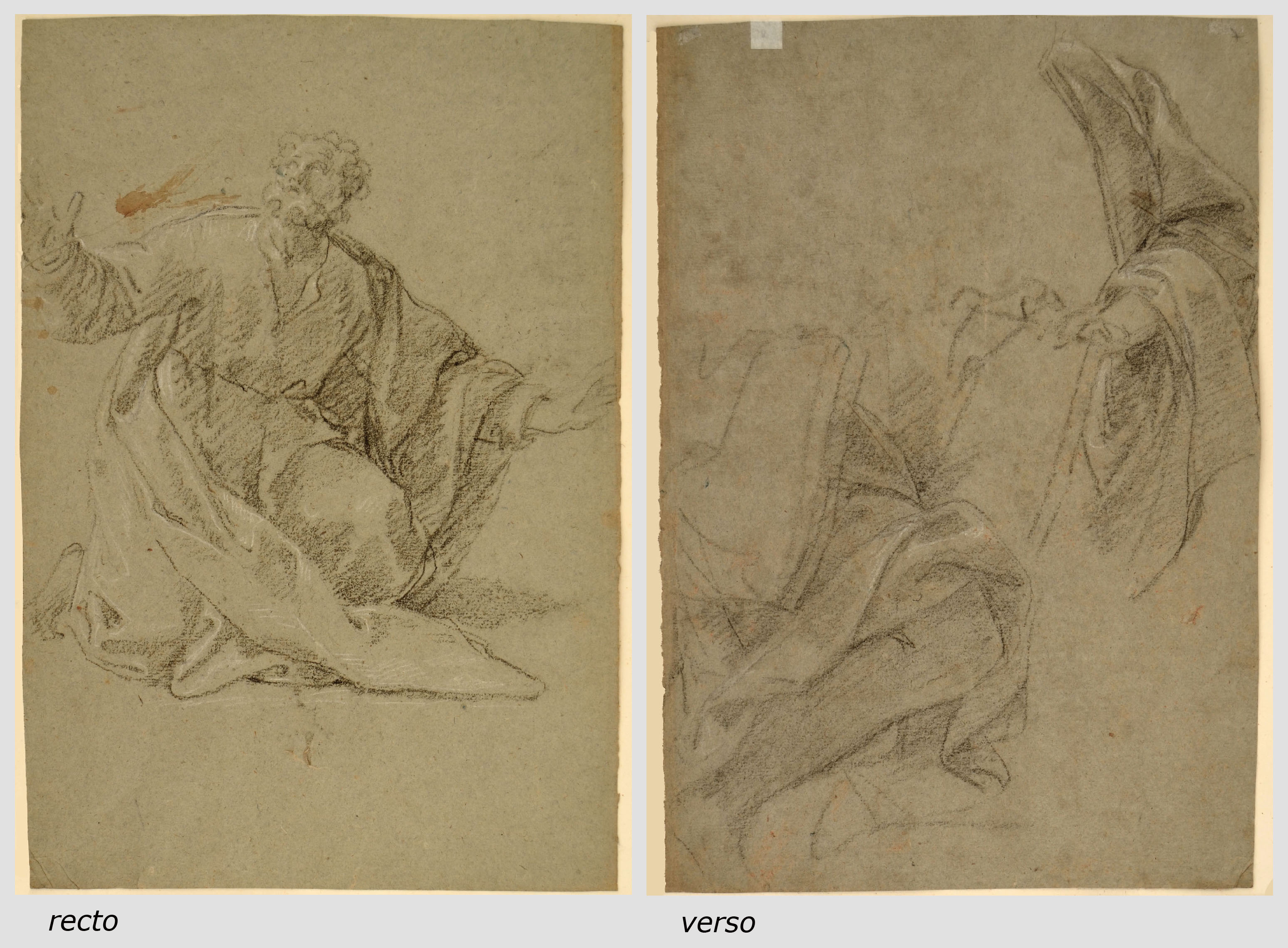The two studies are preparatory for two of the figures of apostles, in the foreground at left, in the large altarpiece l'Assunta, painted by Zoboli, 1732-1735, in the Duomo Nuovo in Brescia. See Vv. Aa., L'immagine del sacro, Brescia 1981; cat. no. 32