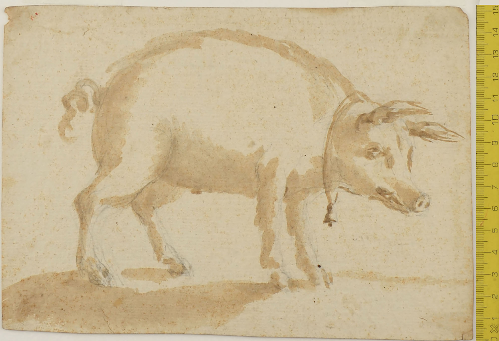 Brush with brown ink, washed in brown, over traces in black chalk. 152 x 215 mm.