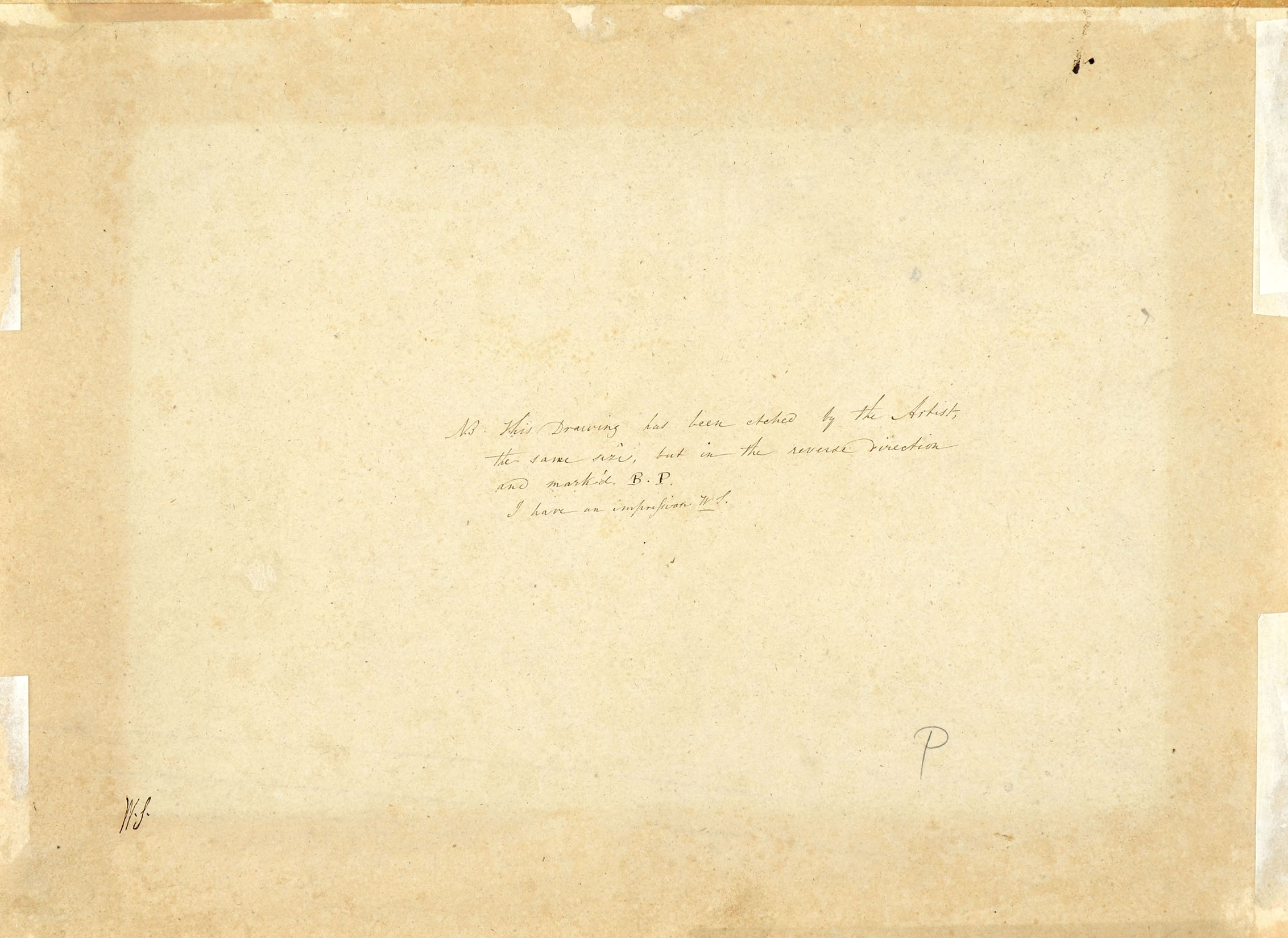 -William Sharp (Lugt 2650), his mark on verso of mount, in lower left corner. Inscription on center of the verso of mount reads: “N.B. His Drawing has been etched by the Artist/the same size, but in the reverse direction and marked B.P./I have an impression W.S.” -London, Sotheby’s, 27 January 1966, lot 157 (as Venetian School, 17th century); sold to Horner