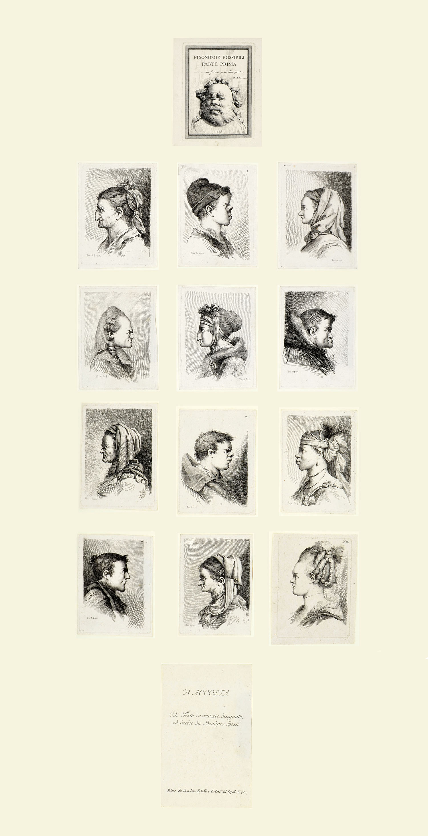 On the title page Bossi introduces the etchings as a collection of possible physiognomies; these are exaggerated for humorous effect, matching the tradition of grotesque heads and caricatures that has existed ever since the days of Leonardo and the Carracci brothers.