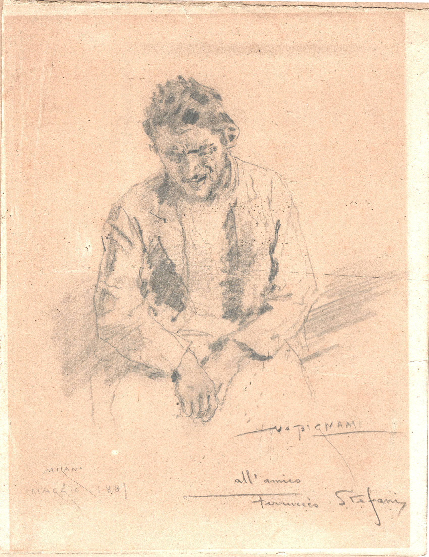 Black chalk. Signed, located, dated and dedicated at bottom V Bignami / MILANO / MAGGIO 1881 / All'amico / Ferruccio Stefani. 293 x 228 mm.