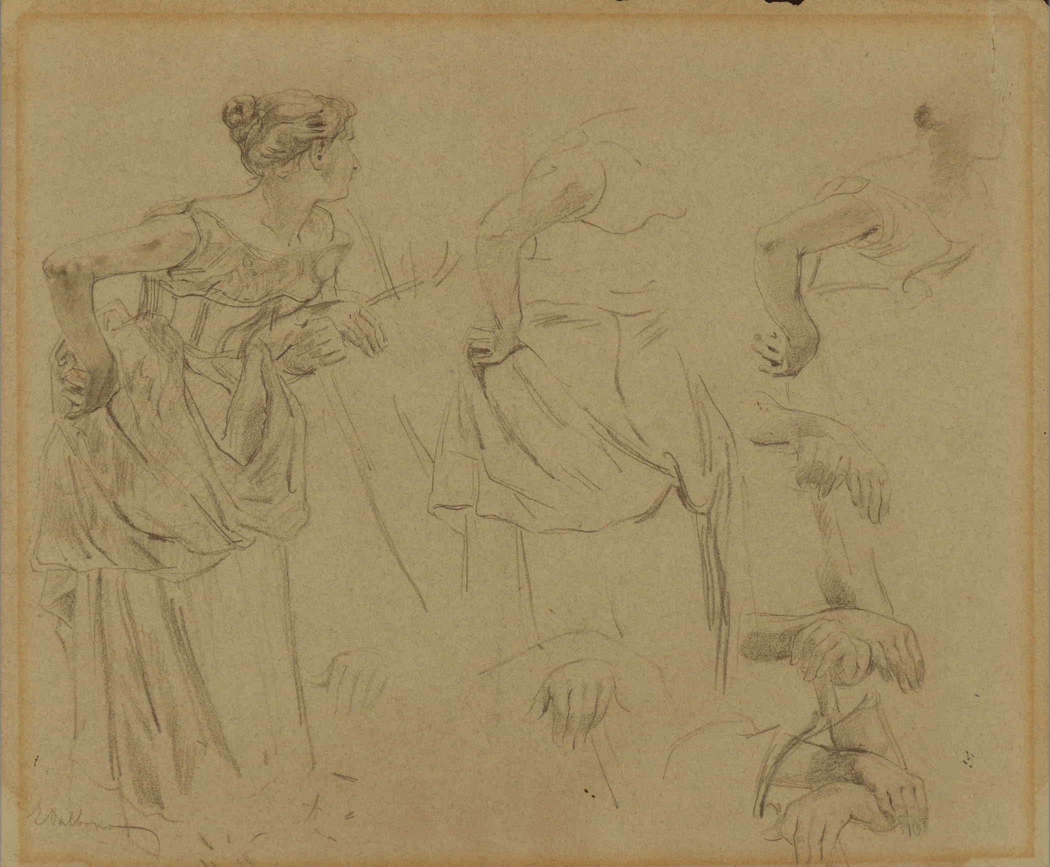 Black chalk, on beige paper, signed E Dalbono bottom left, 292 x 350 mm. Upper right corner made up.