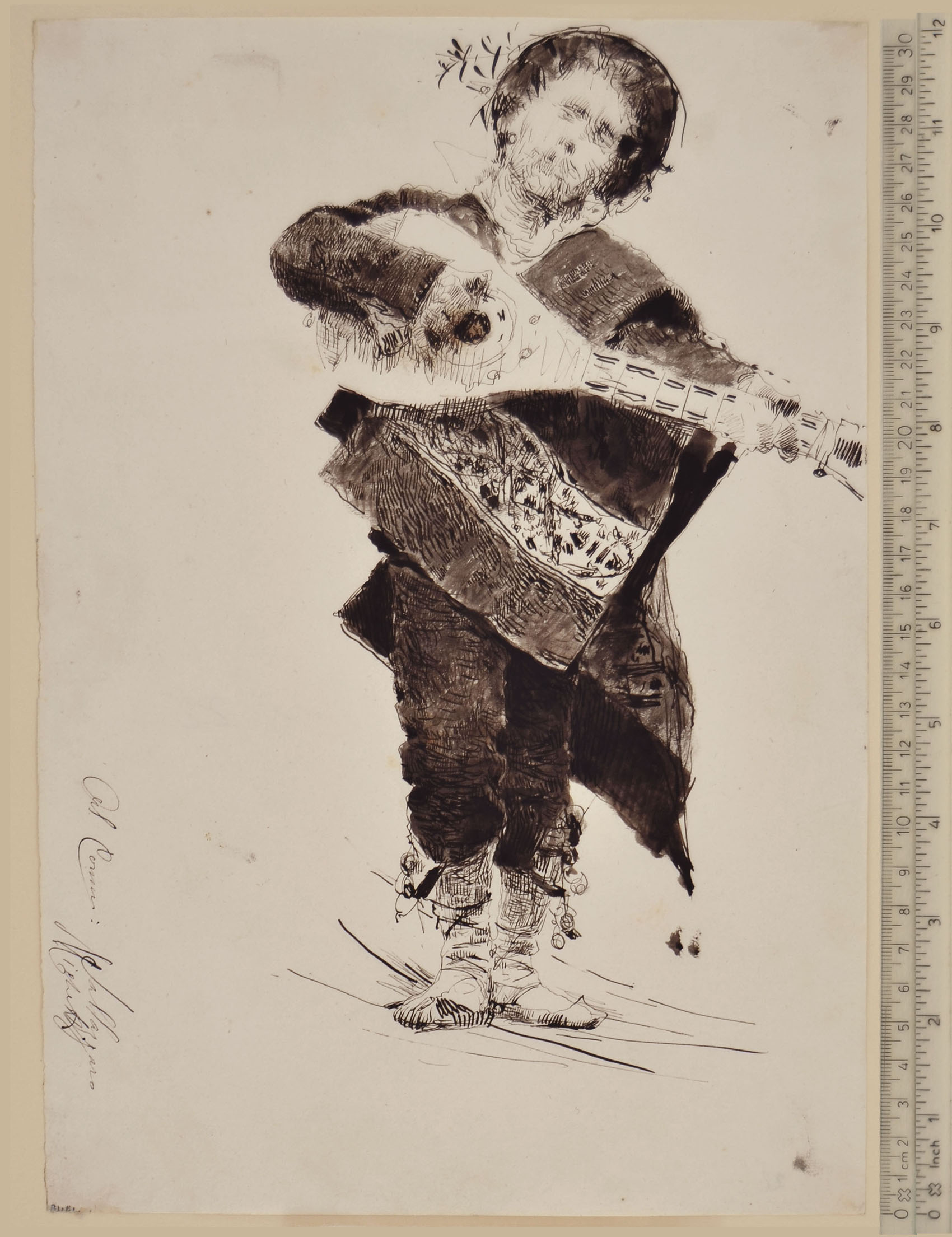 Pen and brown ink, washed in brown. Signed and dedicated in pen Al Comm. Sallazzaro / Michetti; 307 x 213 mm. The dedicatee is probably the painter Demetrio Salazaro (1822-1882) and the drawing is to be dated to the seventies.