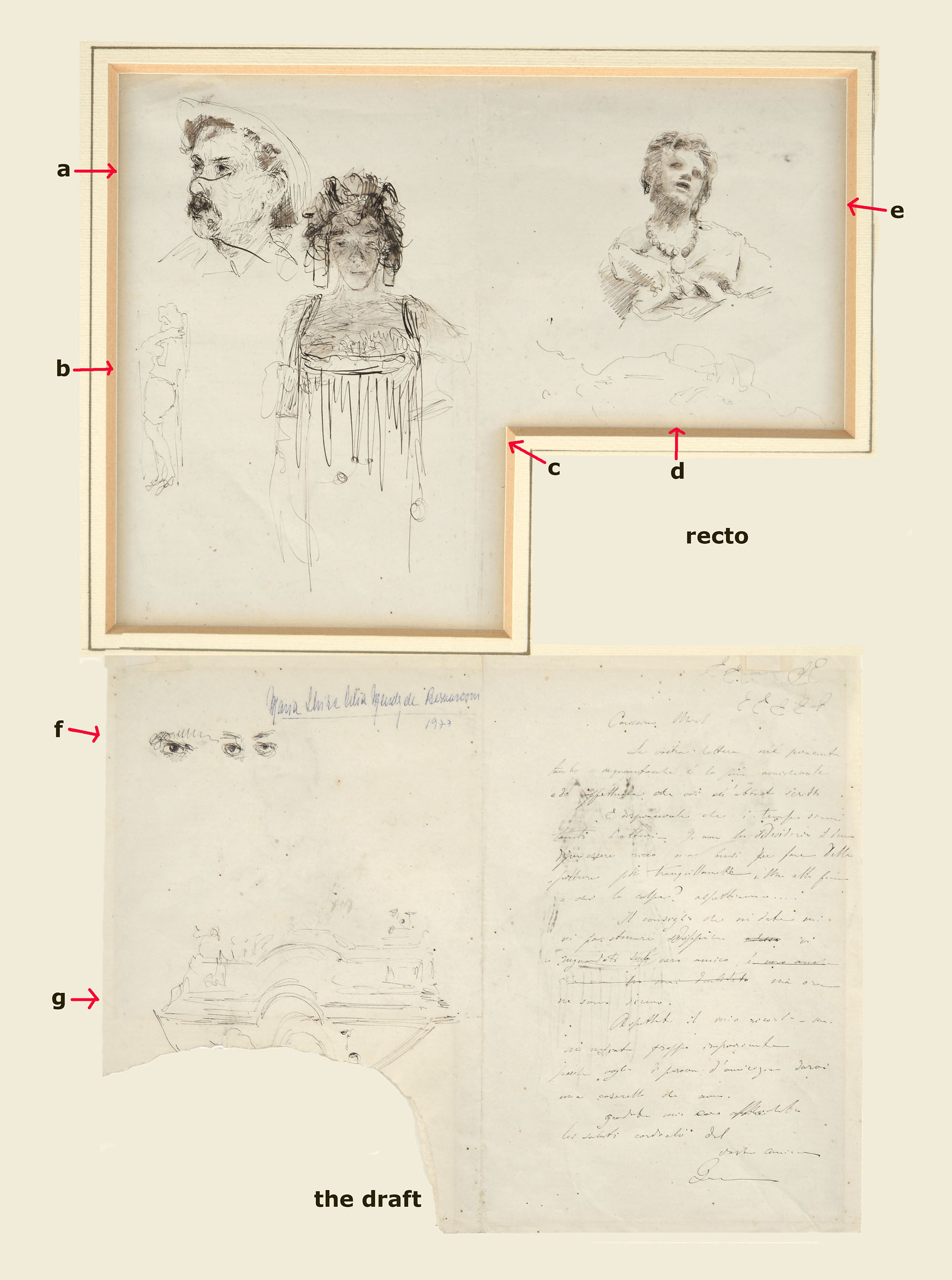 d) a small sketch in pencil of a lying female figure