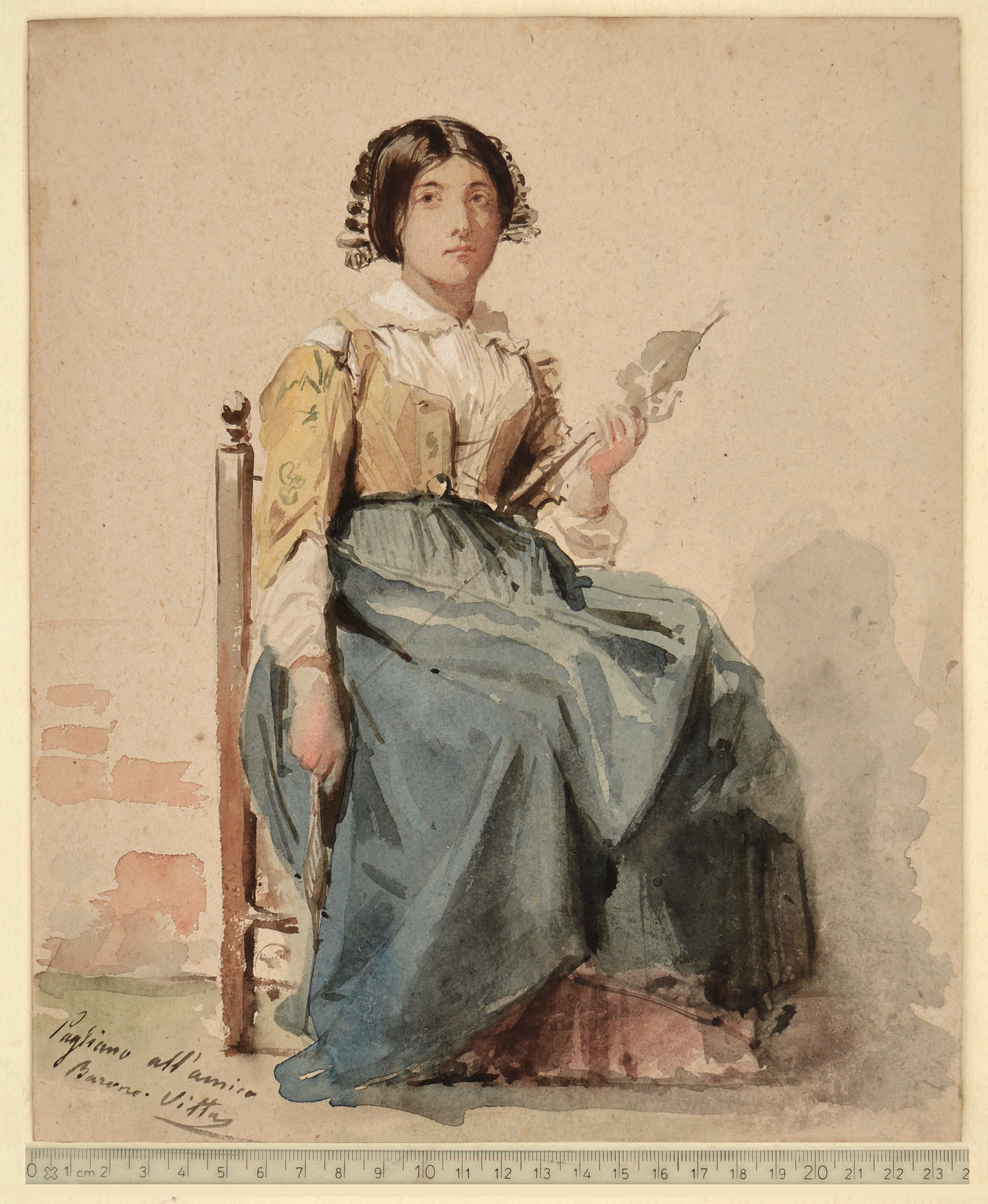 Watercolour, over traces in black chalk. Signed and dedicated at the bottom left corner: Pagliano all'amico / Barone Vitta; 286 x 235 mm. The dedicatee is certainly Giuseppe Raffaele Vitta, a banker and art collector living in Casale Monferrato. Vitta was part of the Jewish group in Casale who supported Cavour and the Italian Risorgimento. For this reason he received the title of Baron in 1855.