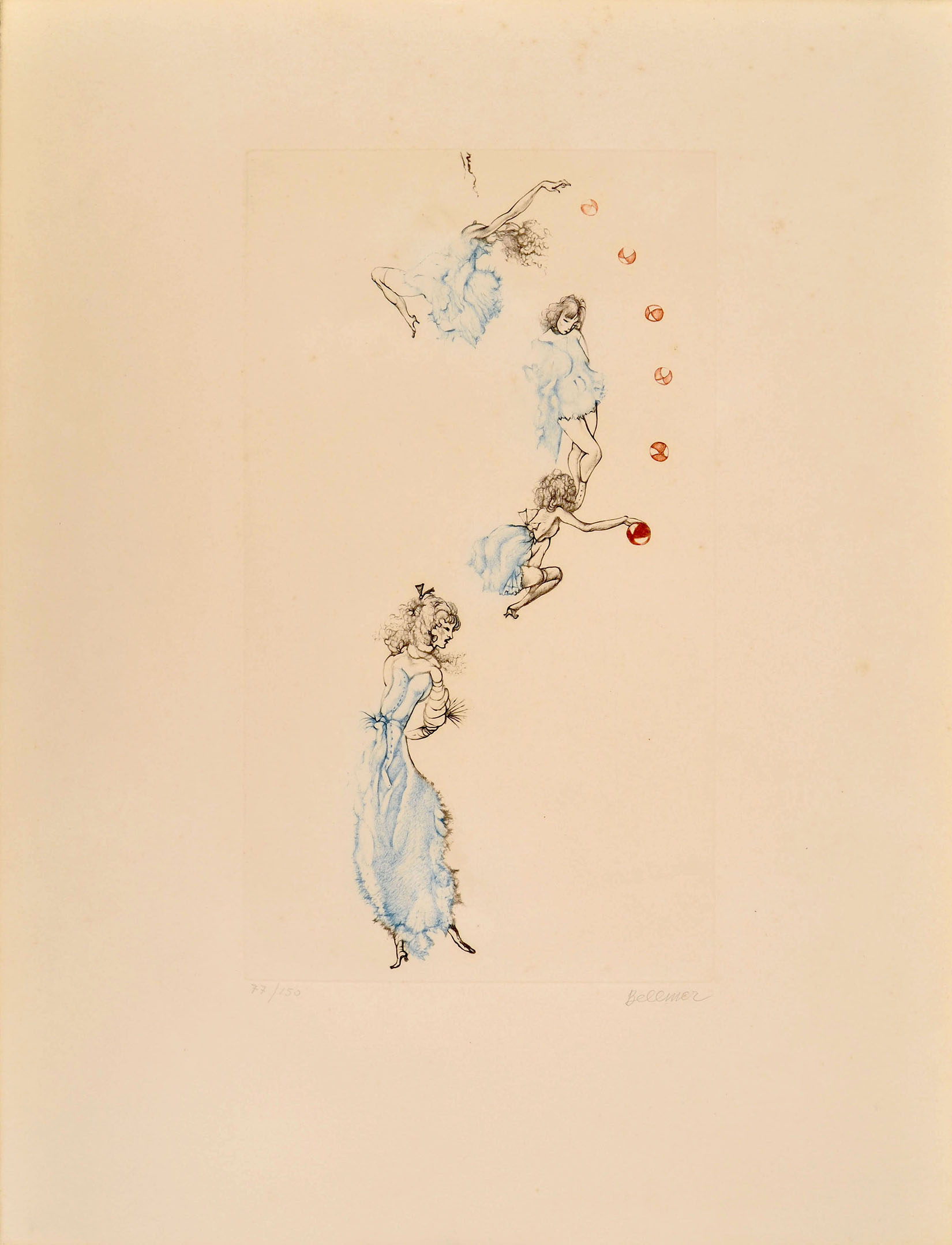 Colour etching. Numbered and signed in pencil at bottom 77/150 Bellmer. To the platemark 430 x 244. The full sheet 653 x 505 mm.