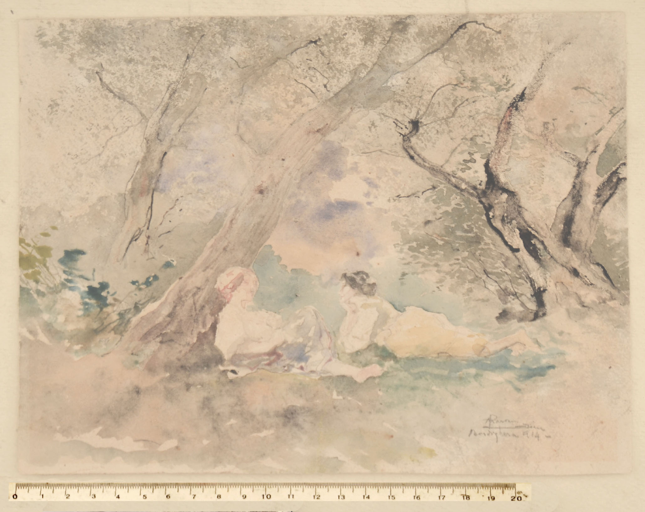 Black chalk and watercolour. Signed and dated PMariani / Bordighera 914. 184 x 244 mm.
