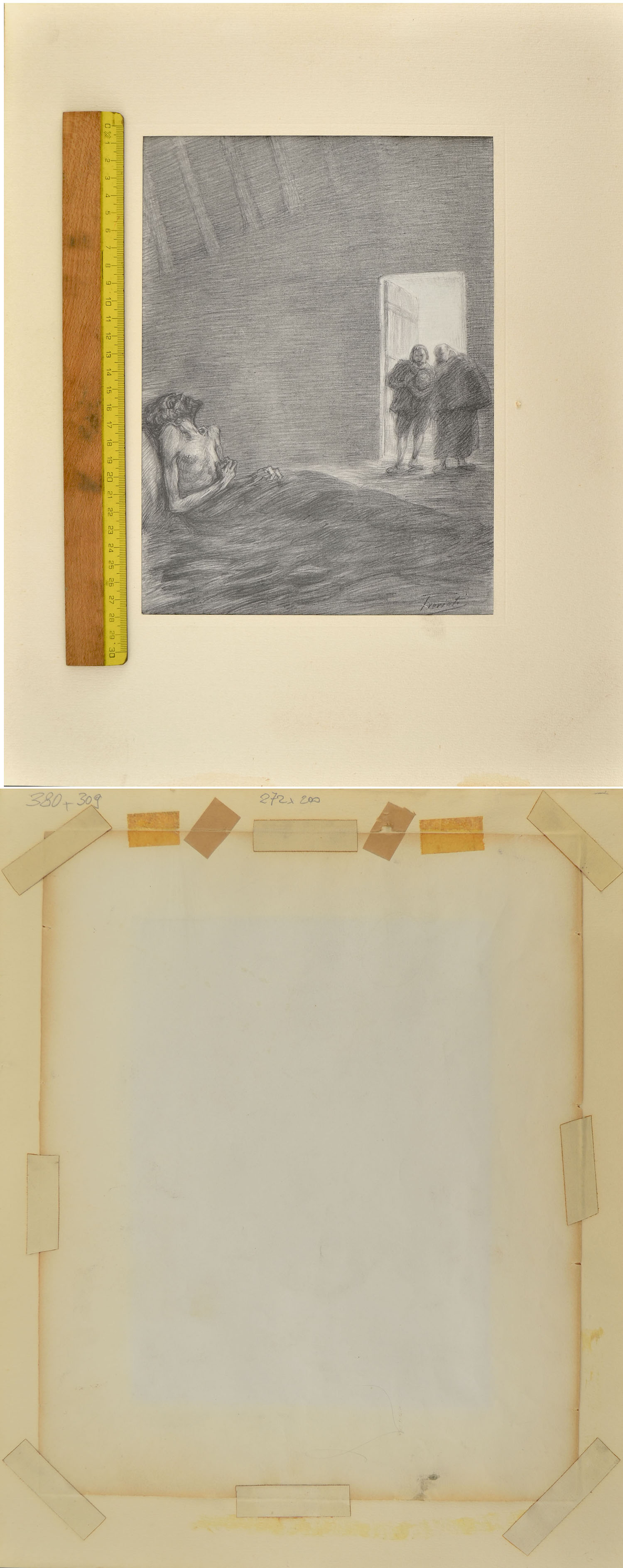 Black chalk, signed Previati lower right. The whole sheet (380 x 309 mm) was glued to the passe-partout with adhesive tapes. Dimensions to the image 272 x 200 mm.
