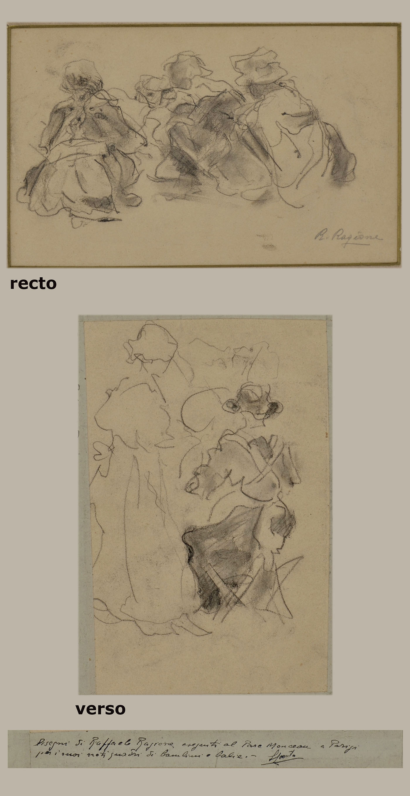 Black chalk, signed R. Ragione. On verso another sketch of female figures and the inscription (on the mount) Disegni di Raffaele Ragione eseguiti al Parc Monceau a Parigi / per i suoi noti quadri di bambini e balie (unidentified signature). 225 x 149 mm.