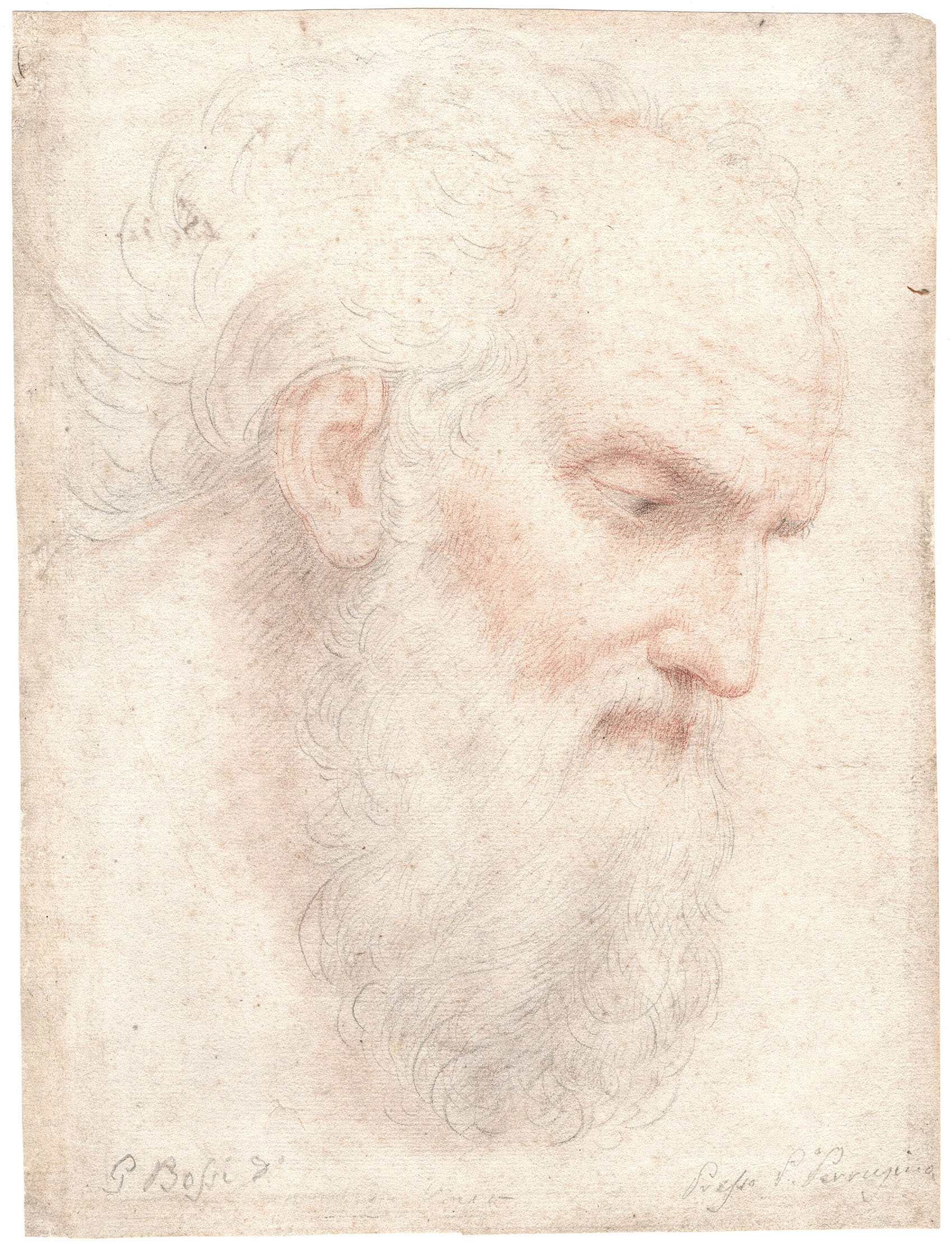 Black and red chalks, stumped. On laid paper bearing the watermark Dove on three mountains, inscribed in a circle, surmounted by the letter F. 245 x 185 mm. Signed in black chalk at bottom left G. Bossi d°, annotated by the artist at the bottom right Presso P.° Perrugino (sic). Another annotation by the artist in black chalk is on the verso: Presso Pietro Perugino / Quadro nella Cappella Sistina. On the verso there is also a 19th century inscription Bossi in brown ink.