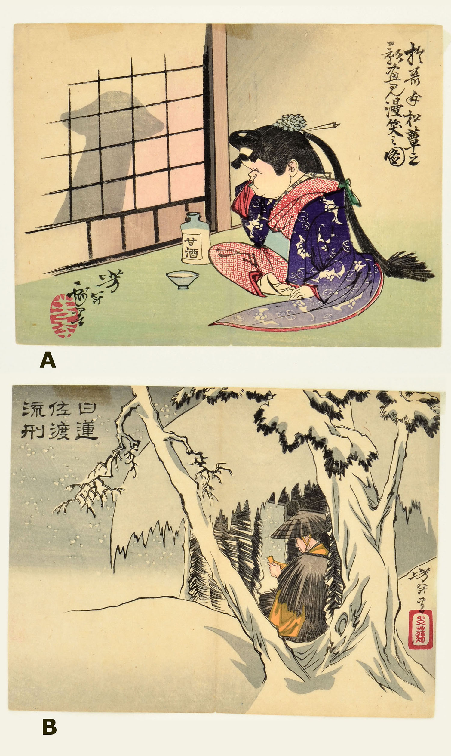 B) Nichiren in Exile at Sado: colour woodblock print, horizontal chuban. Signed Yoshitoshi ga, red seal Taiso. Slight trace of vertical fold in the center; 178 x 233 mm.
