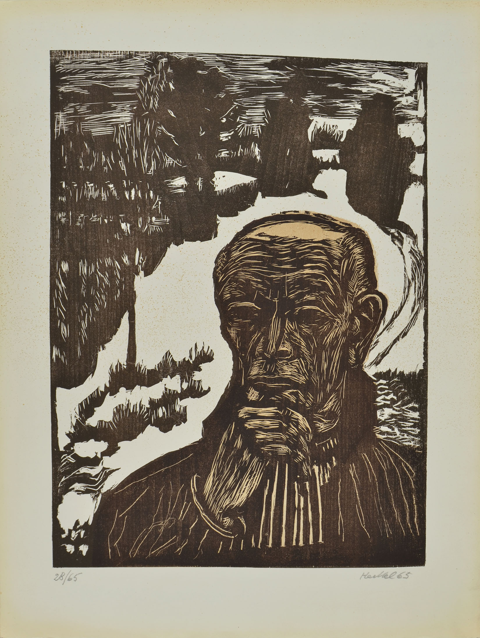 Colour woodcut from two blocks, 1965, from Europaische Graphik IV, published by Galerie Ketterer, Munich, in an edition of 65 with arabic numerals on Rives paper and XXXV with roman letters on Japanese paper. Signed and dated in pencil Heckel 65 and numbered 28/65. On Rives. With the Ketterer blind stamp. Paper lightly toned at the edges and lightly foxed. The image 516 x 381 mm, the entire sheet measuring 657 x 500 mm.