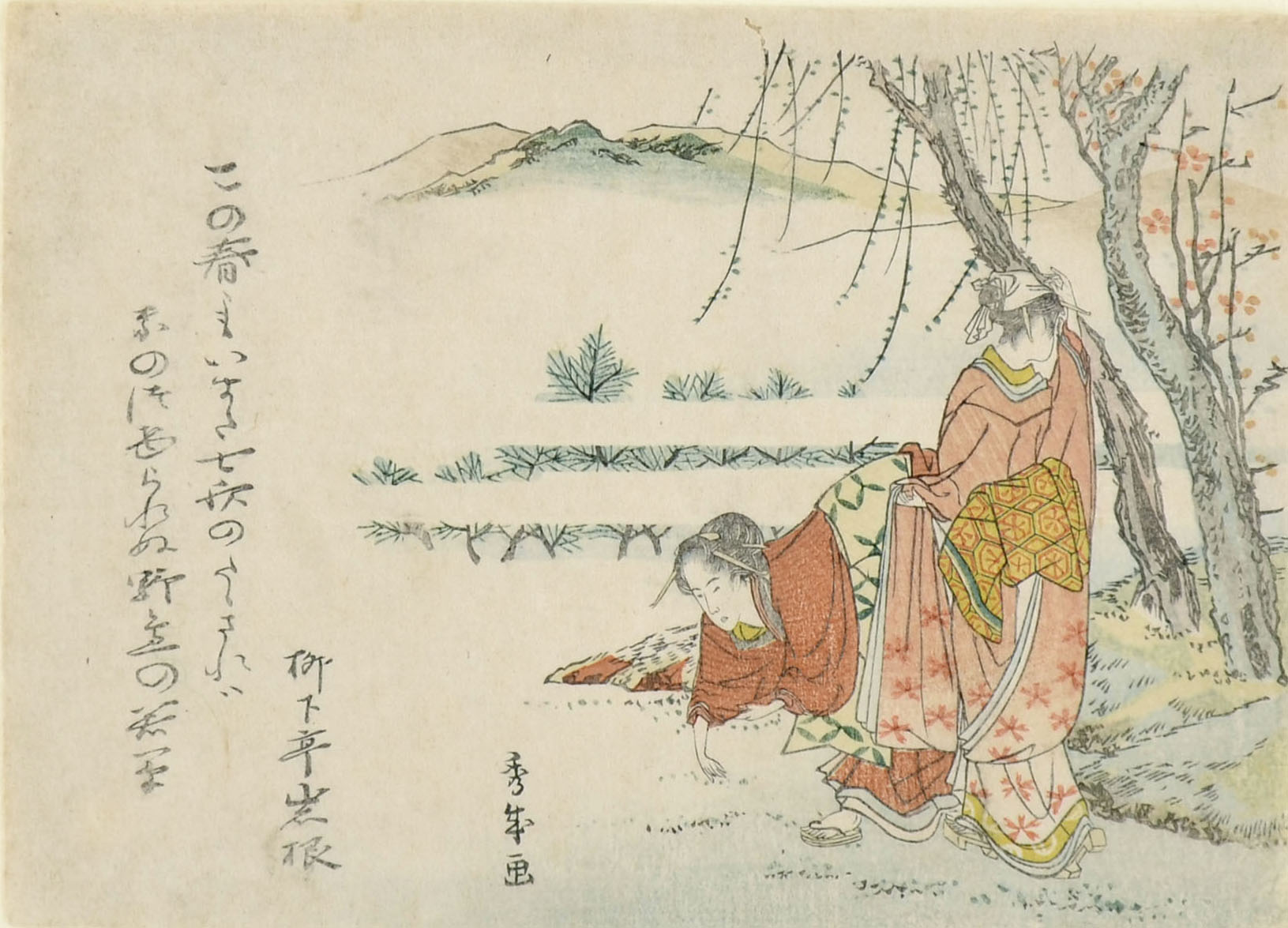 I was not able to read the signature of this delicate surimono from the school of Hokusai, dating back to the early nineteenth century. The first character is certainly SHU.