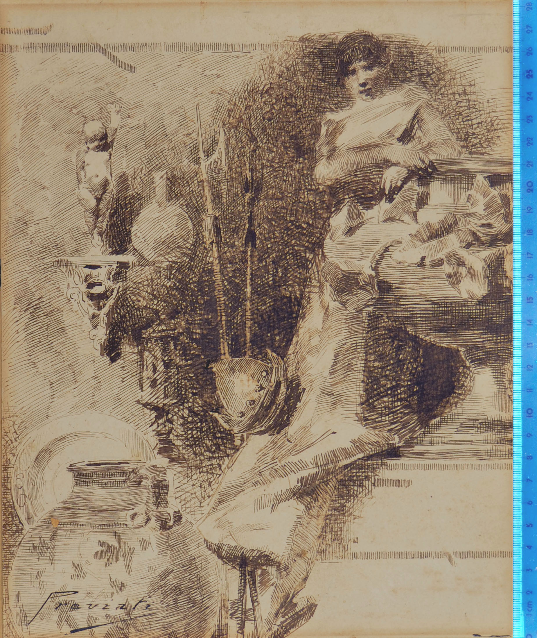 Pen and brown ink. Signed Previati bottom left. 283 x 228 mm