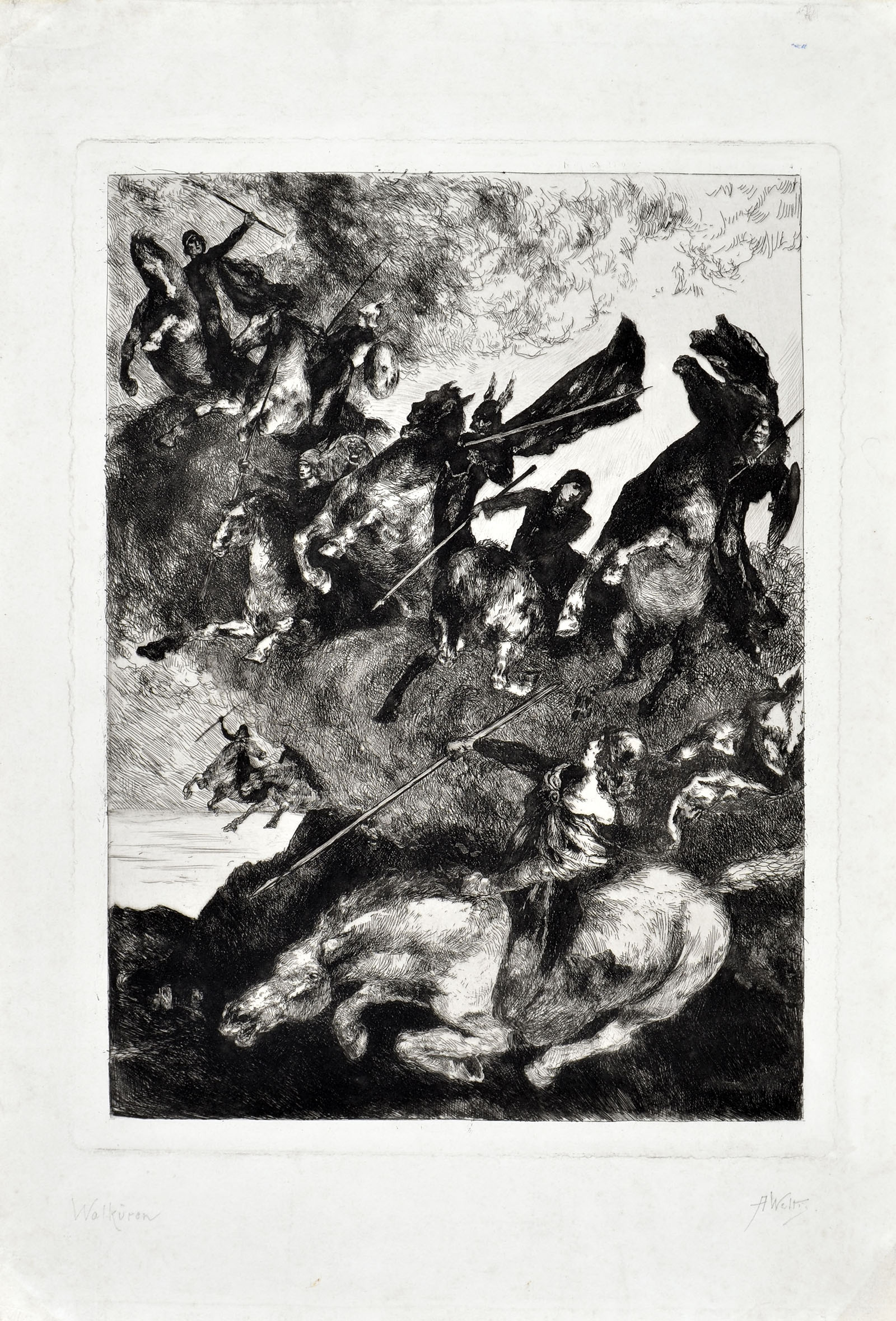 Etching and drypoint on zinc plate. Wartmann 11. A fine impression of state III of VII, edition a, printed with black ink. Fine condition. Titled and signed in pencil on the lower margin Walküren / AWelti. To the platemark 396 x 300 mm, the full sheet 525 x 360.