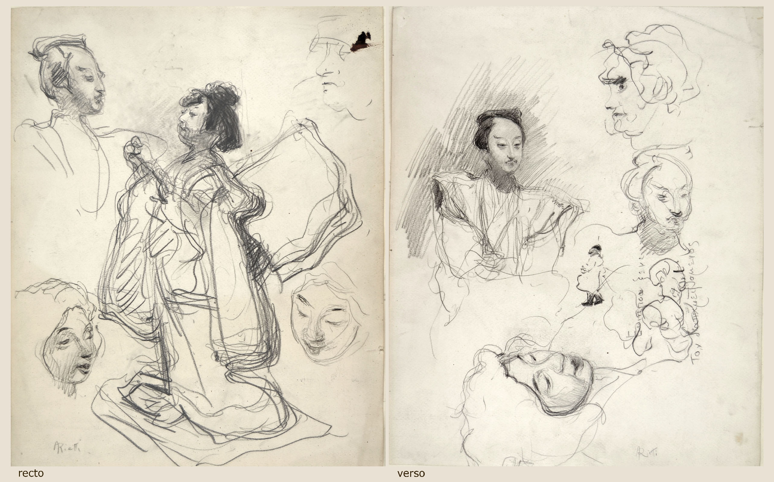 In the article there is a photo of a group of Japanese puppets that belonged to Rietti; the head of one of these is sketched on the front and back of the present drawing.
