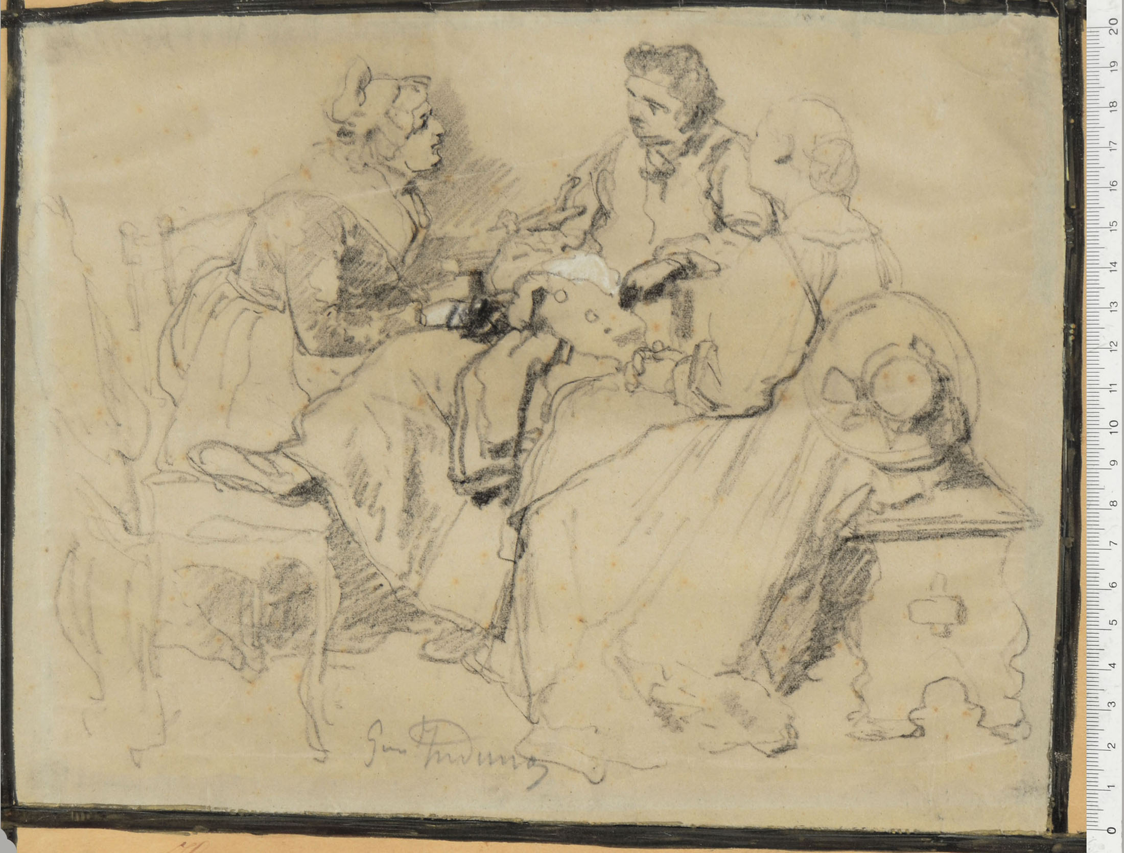 Black chalk heightened with white, on beige paper. Signed Ger Induno in black chalk. Pasted to a cardboard. 205 x 263 mm.