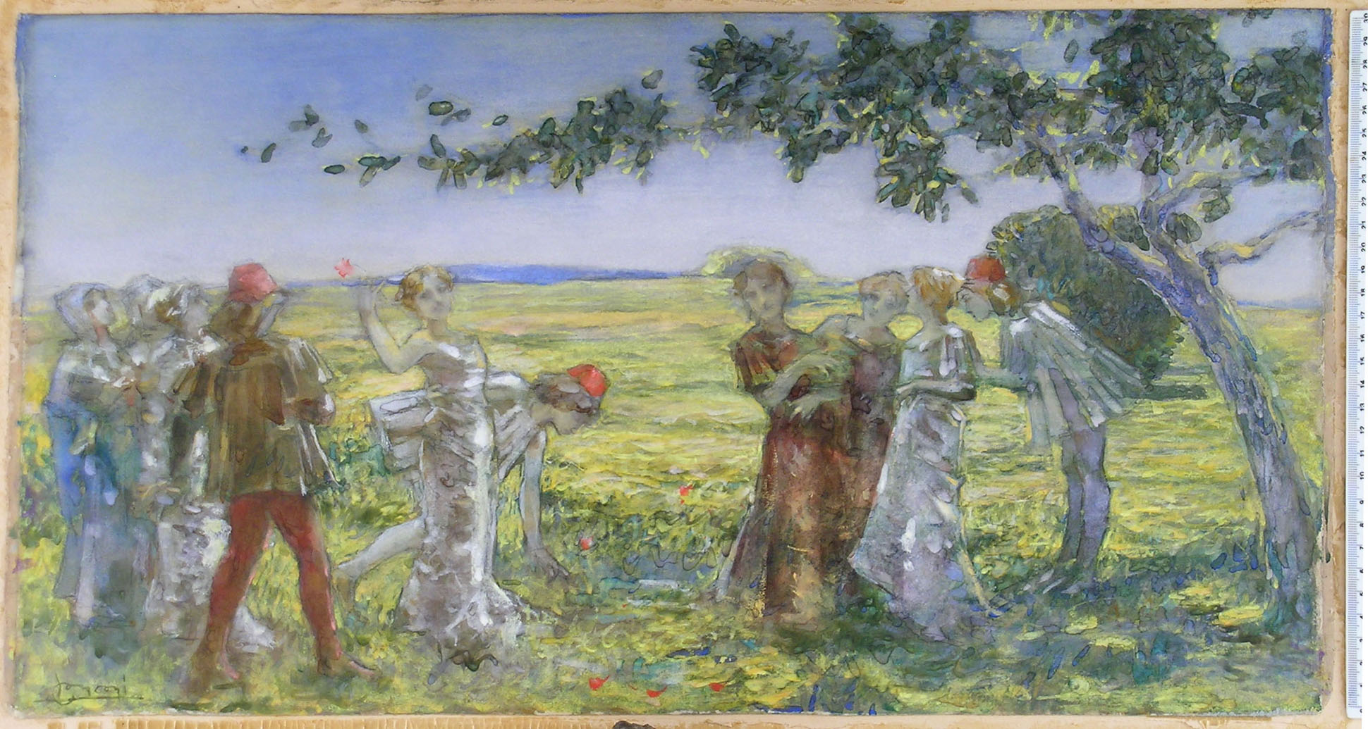 The subject is certainly connected with the series of paintings which Conconi called Tales and Legends, which was intended to compose a polyptych of six paintings. The most famous of them is I Novellieri, recently sold at Sotheby's, Milan. The theme of the reading of the Decameron during the ten days was one of the favorites by the Scapigliatura. See R. Giolli, Luigi Conconi. Architetto e Pittore, Rome and Milan, 1920, pages 54,55, 64-65.