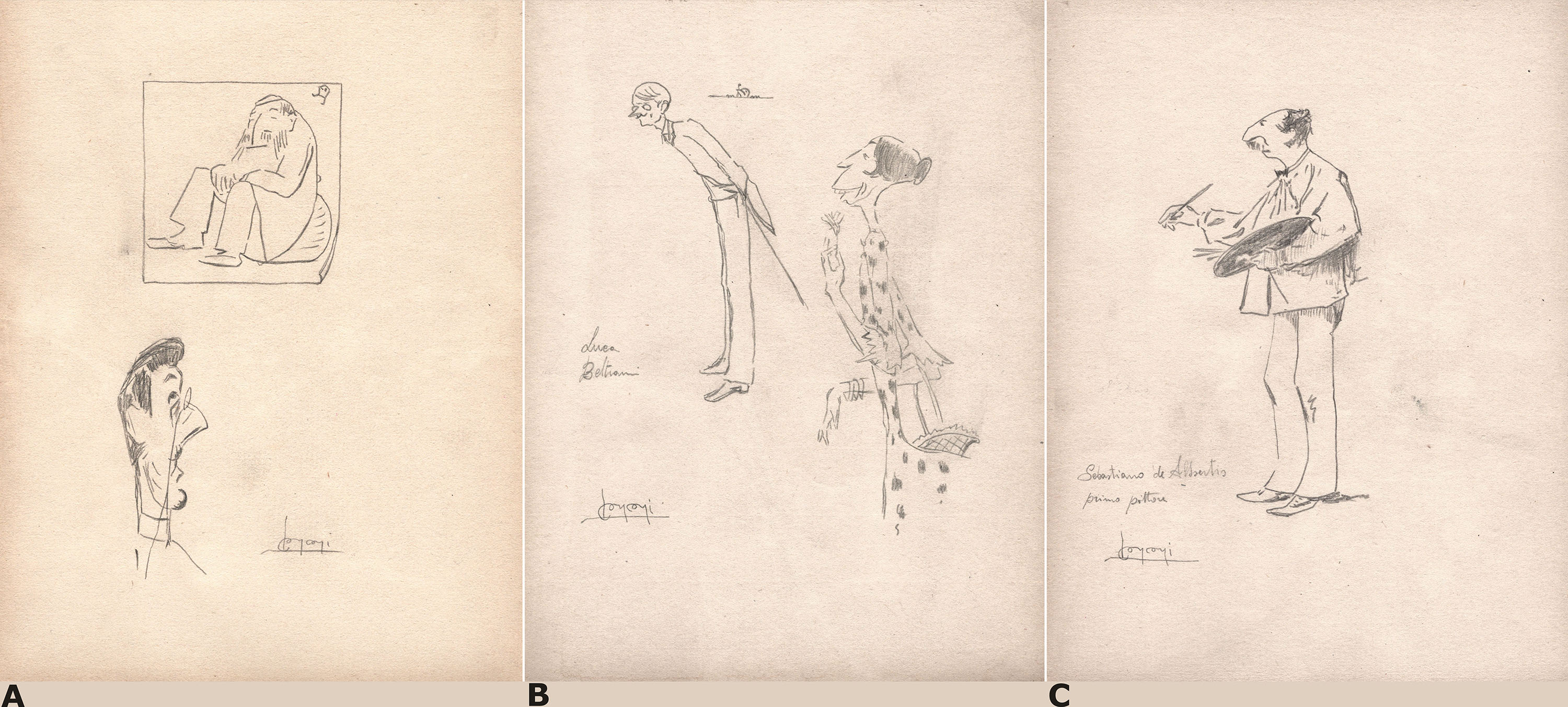 C) Caricature of the painter Sebastiano de Albertis; black chalk, 280 x 216 mm. Titled and signed in black chalk Sebastiano Albertis / primo pittore / LConconi.