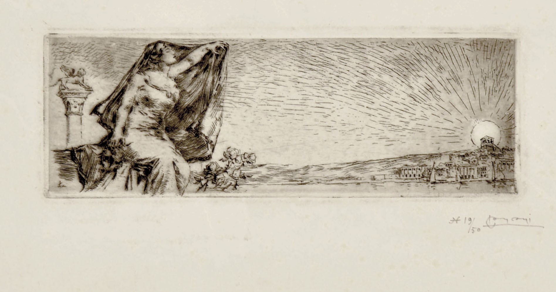 Etching, a fine impression of the only state, skillfully printed with black ink working on the surface tone, on thick white wove paper. Signed with the monogram LC in the plate; numbered and signed in pencil at the bottom right margin N 19/50 LConconi.