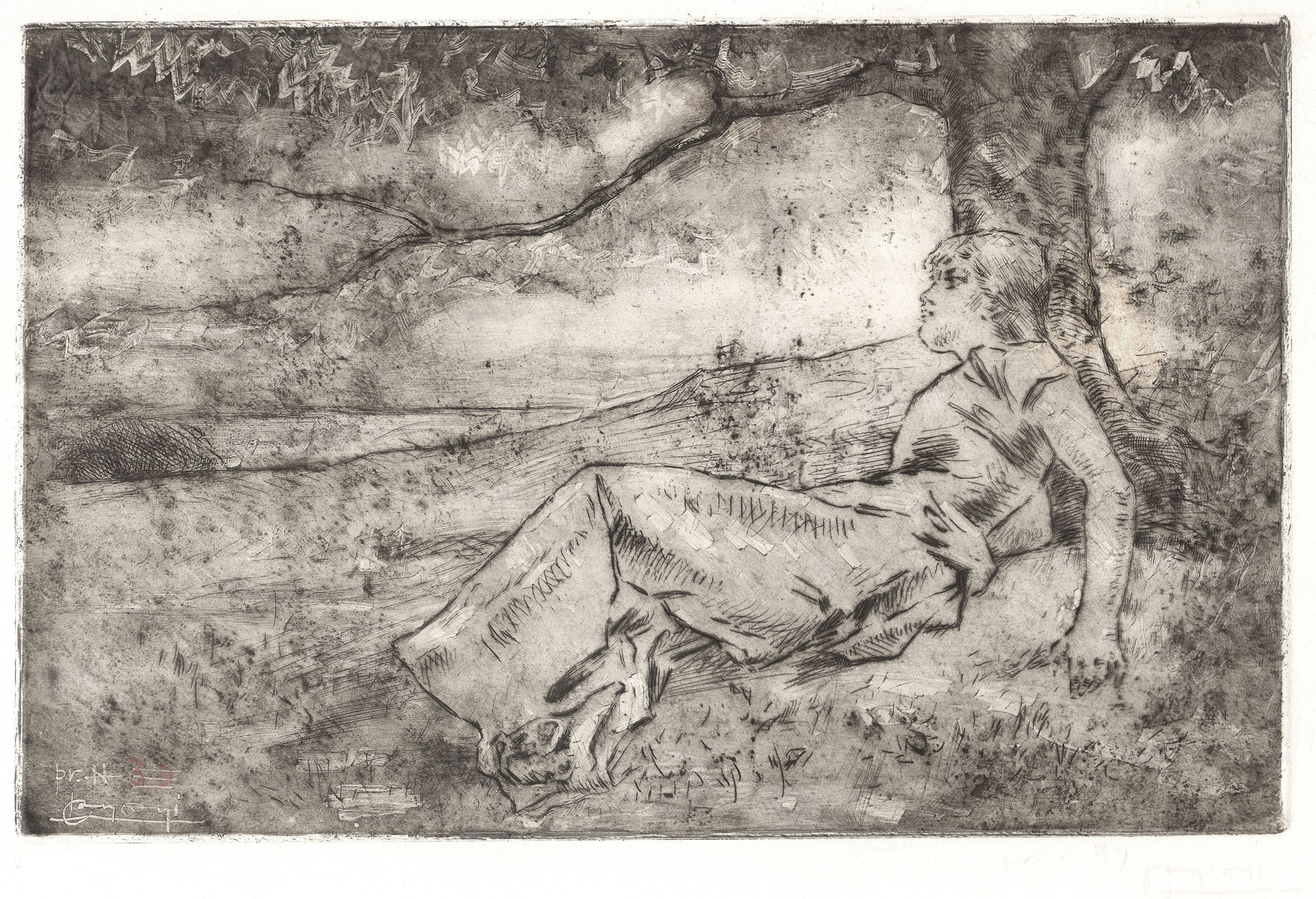 Etching (acquaforte monotipata), a fine impression of the only state, skillfully printed in black ink working on the surface tone with monotypic effects; on thick, white wove paper. Signed LConconi in the film of ink left in the plate in wiping and numbered in the same way pr. N and inscribed 39 in red chalk. Minor abrasions at the margins caused by the silverfish, in very good condition. To the platemark 210 x 325 mm, the entire sheet measuring 297 x 463 mm. See M. Bianchi, G. Ginex, Luigi Conconi incisore, Milan, 1994; cat. no. 52.