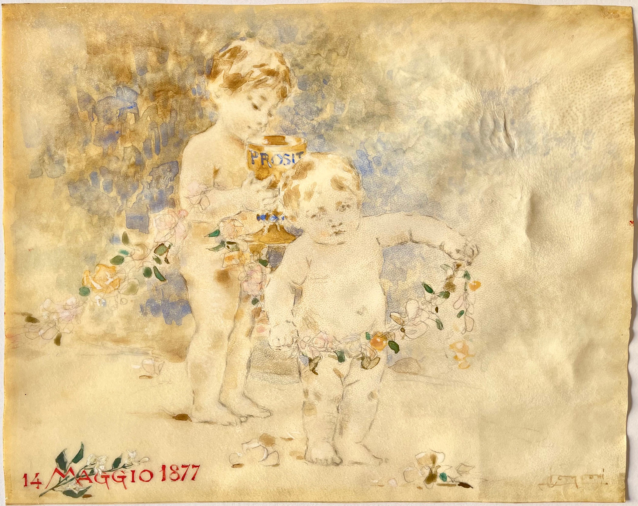 Pen and watercolour on vellum; signed LConconi in pen bottom right, dated 14 MAGGIO 1877 in red ink bottom left. 215 x 270 mm.