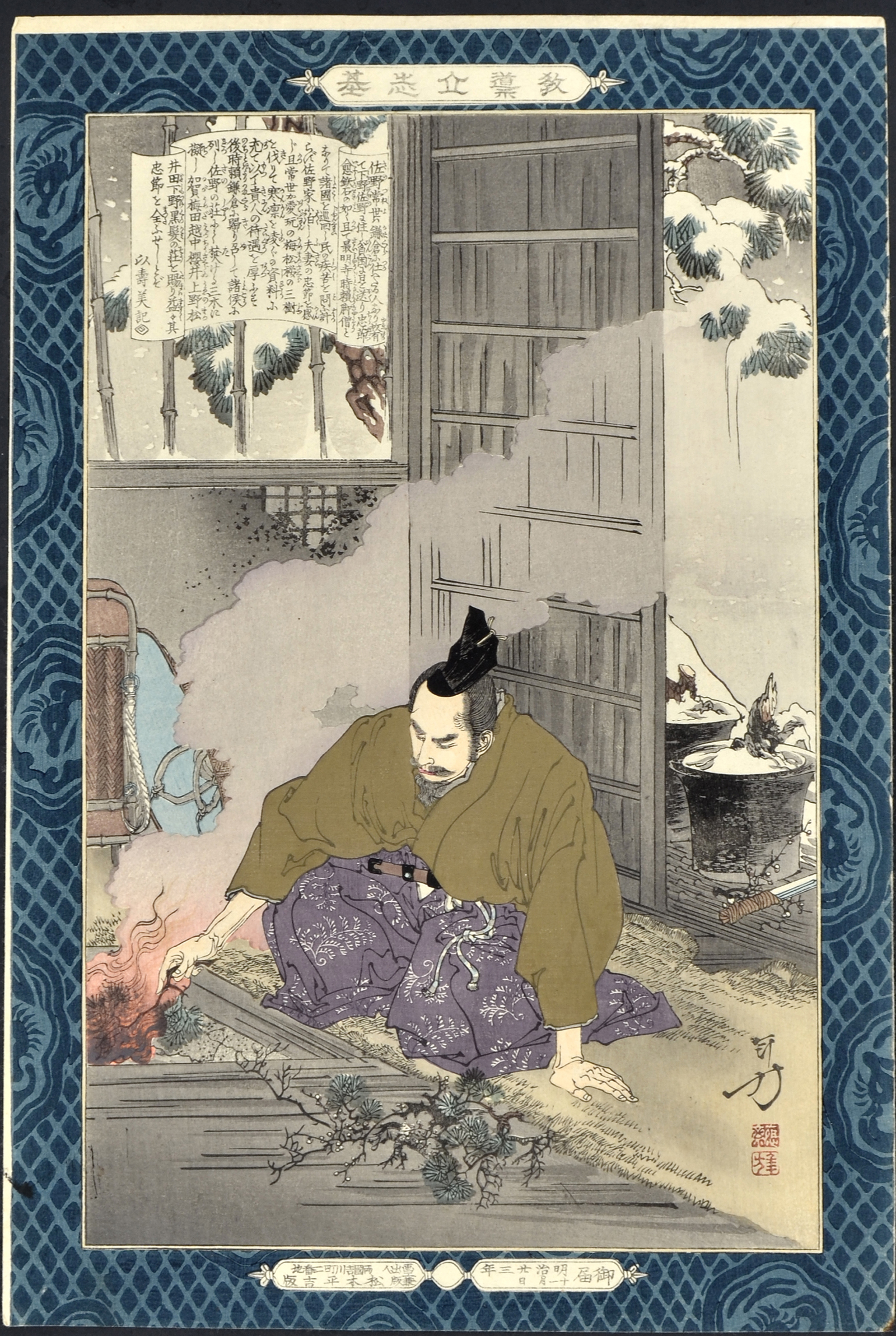 The print portrays the thirteenth-century dispossessed and impoverished daimyo Sano Genzaemon Tsuneyo burning his cherished bonsai to provide warmth to a an itinerant priest, who turns out to be the regent Tokiyori (1226-1263). The scene is based upon the first scene in the Noh play Hachi no ki (The Potted Trees), by the playwright Zeami (1363-1443).