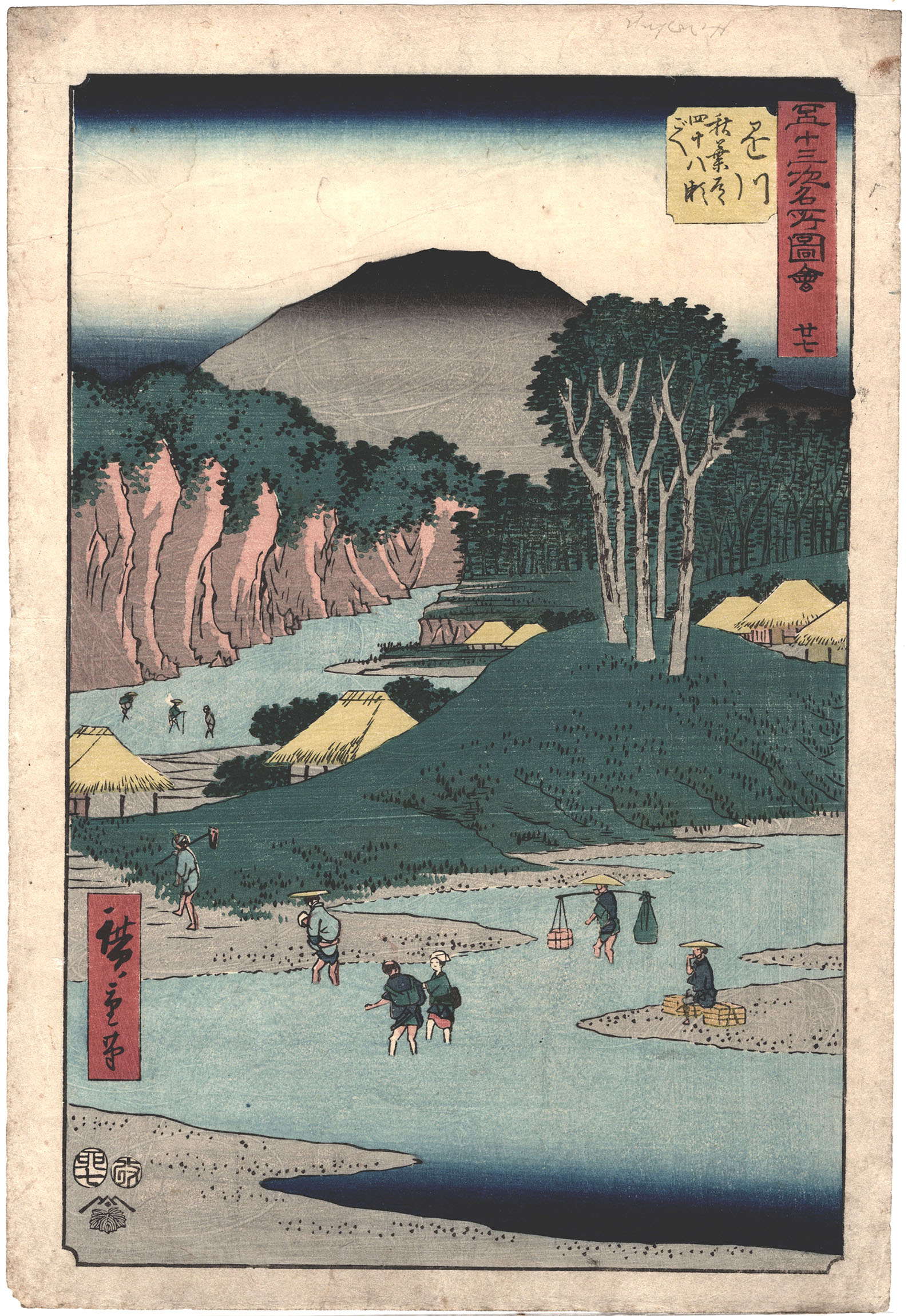 Colour woodblock print, 1855, from the Upright Tokaido (Pictures of the Famous Places on the Fifty-three Stations), oban tate-e. Published by Tsutaya Kichizo. Signed: Hiroshige hitsu. Very good impression and colour; minor flaws, good condition. 375 x 257 mm.