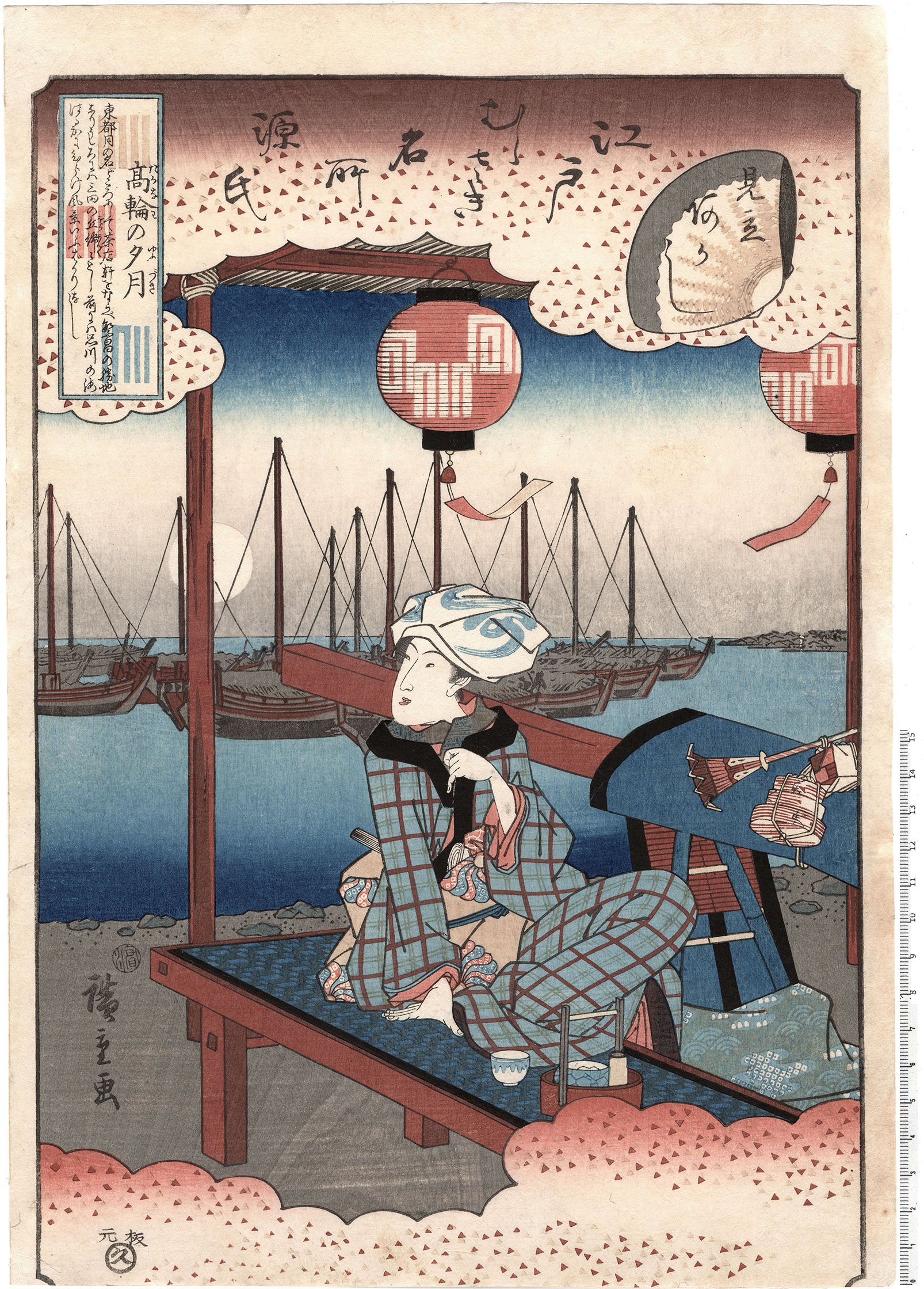 Colour woodblock print, from the rare set of three, in vertical oban format, Murasaki’s Genji in Famous Places of Edo. The series, published by Ibaya Kyubei, associates feminine beauties and Edo locations with Genji chapters and with the triple canonical theme Snow Moon Flowers.
