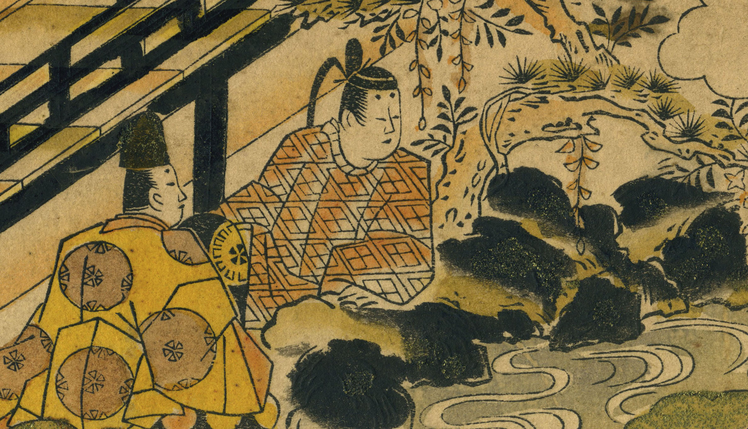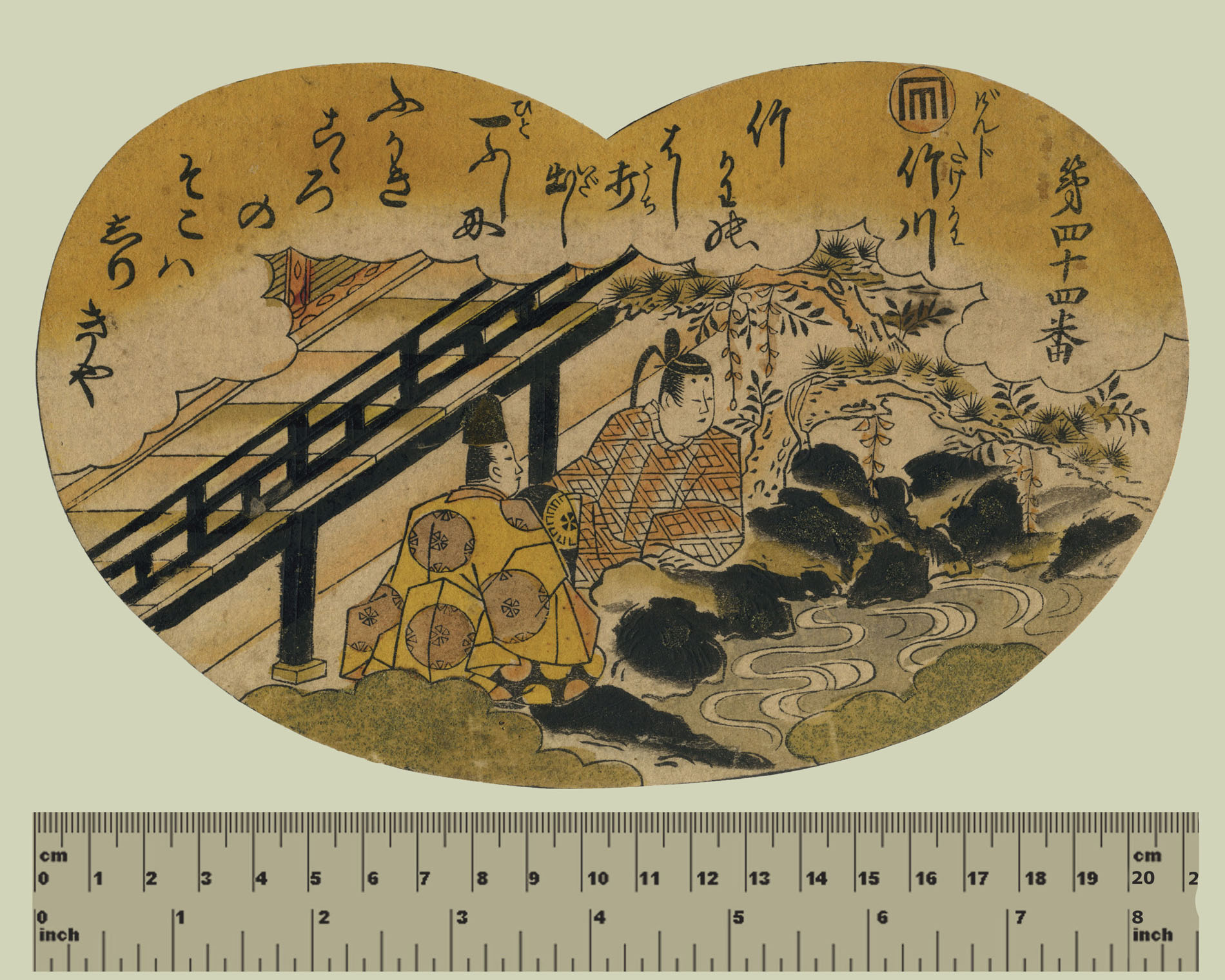Woodblock print (beni-e) with hand-applied and stenciled colour and metallic powder; some urushi (shining glue). The print belongs to a series, of the greatest rarity, which presumably contained fifty-four designs, one for each chapter of the Tale of Genji. According to Waterhouse this series has been designed by Shigenaga (the first twenty-six chapters) and Kiyomasu II (the remaining twenty-eight). See D. Waterhouse, Images of Eighteenth-Century Japan, Ukiyoe prints from the Sir Edmund Walker Collection, exh. cat., Royal Ontario Museum, Toronto 1975; cat. nos. 40, 41, 42, pp. 81-87. The series was in horizontal hosoban format, each print including the subject in a fan-shaped frame at the center. This type of heart-shaped or fan-shaped print is known as haribako-e, literally, pictures to decorate boxes. It was very popular in the Kyöhö era (1716-1736). People cut haribako-e out and pasted them on boxes for small objects, onto sliding doors and folding screens. For this reason often we find this very rare kind of primitive prints trimmed.