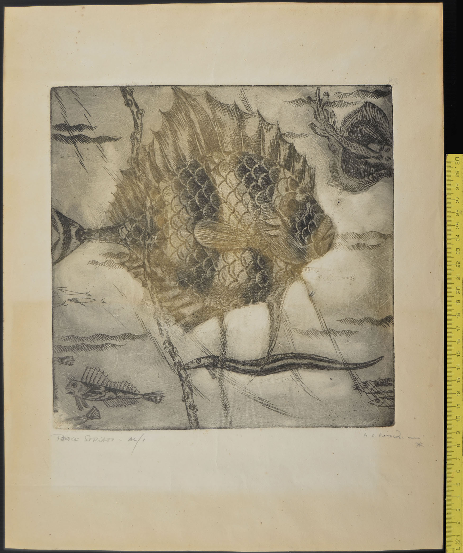 Etching and aquatint printed in two colours. Signed in the plate VENEZIANI, titled, numbered and signed in pencil at bottom PESCE STRIATO AL/I U. C. Veneziani.
