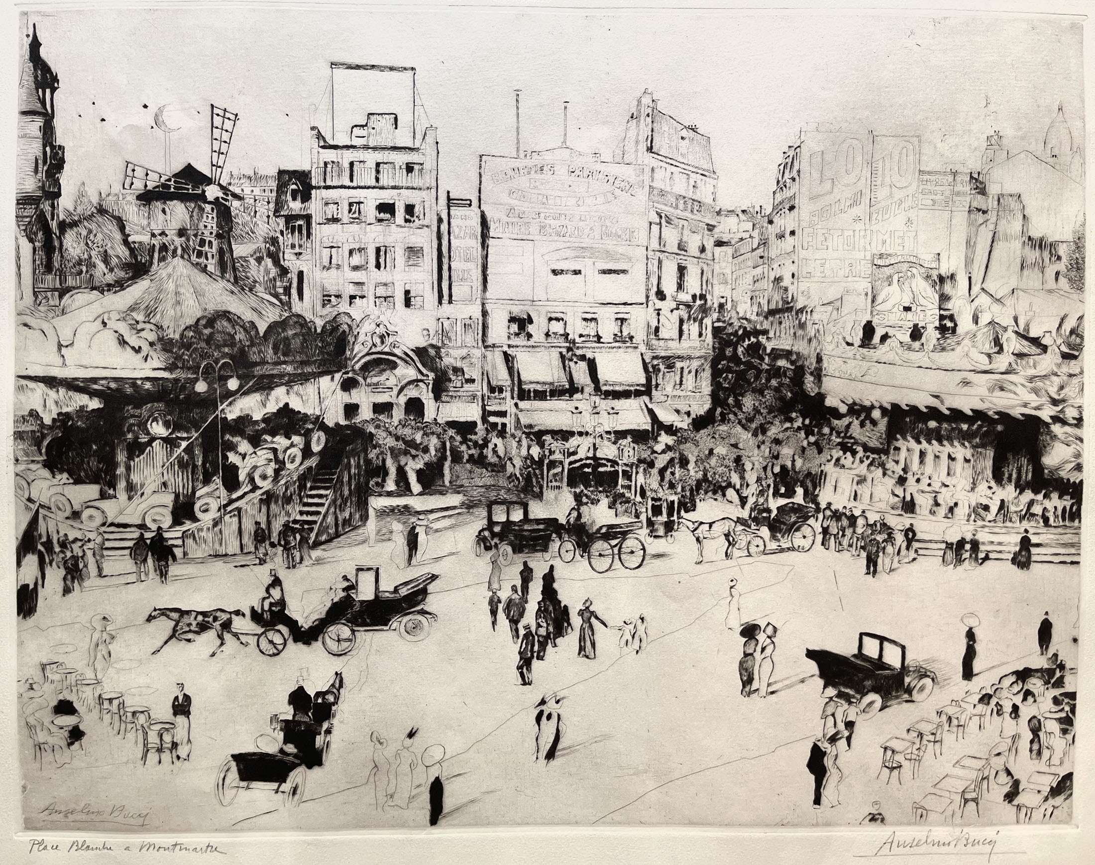 Drypoint, 1910, signed in the plate Anselmo Bucci, titled and signed in black chalk at bottom Place Blanche a Montmartre / Anselmo Bucci. Fine impression on wove paper, in very good condition. To the platemark 480 x 620 mm, the full sheet measuring 650 x 775 mm.