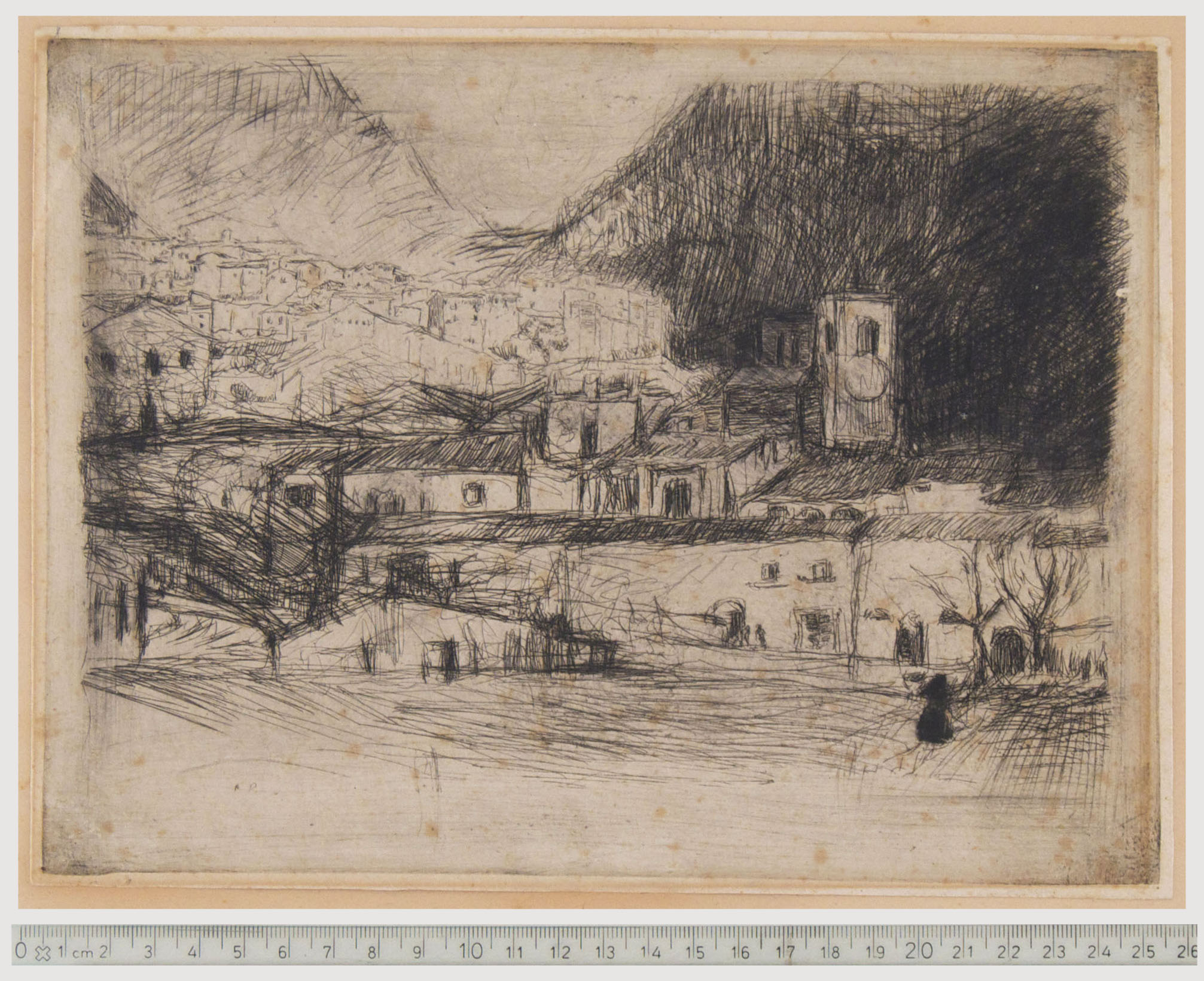 Etching, 1921, Ficacci 1997 no. 20. As the collectors of Bartolini's etchings well know, this is a very rare print. The impression presented here is an early state, apparently unknown till now, before completion of the hatched area in the lower part of the foreground. See here a comparison with an impression of the later state, described by Ficacci as the first state. The total lack of any handwritten indication, makes me think that this is an artist's proof. The impression, richly inked, is printed on wove paper, with small margins. It is pasted on the top corners to a light cardboard. It is lightly foxed. To the platemark 186 x 249 mm.