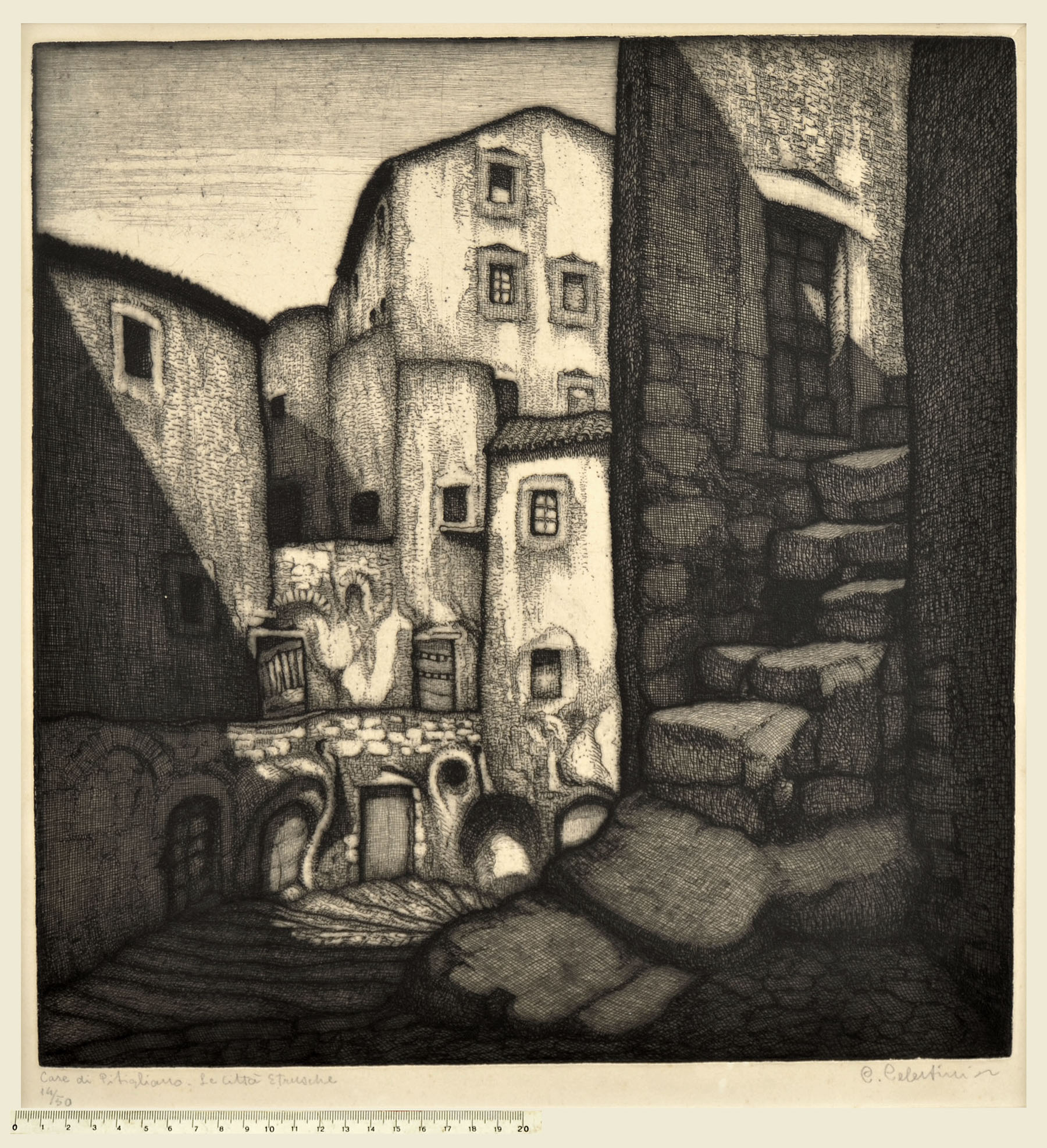 Etching. Fine impression. Numbered, titled and signed in pencil at bottom 14/50 / Case di Pitigliano. Le città Etrusche / C. Celestini.