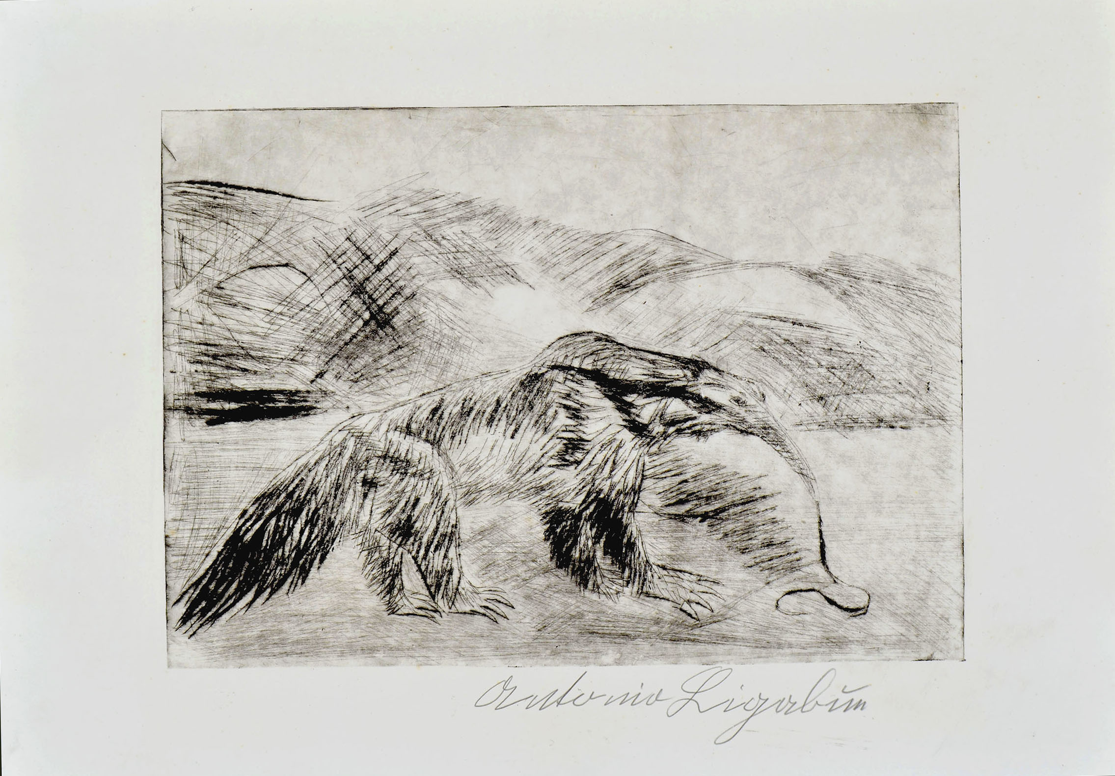 Drypoint, 1960. An impression from the first edition of ten printed by Arnaldo Bartoli in Guastalla, consisting of ten unnumbered impressions. Pulled on thick, wove paper. Signed in pencil on the lower margin Antonio Ligabun. In the subsequent edition of nine, printed by Alberto Manfredi in 1961, the lower corners of the plate are rounded and the inking is more uniform. Moreover our specimen shows signs of having been printed with greater pressure on one side of the plate than the other. To the platemark 242 x 340 mm, the full sheet 350 x 495 mm.