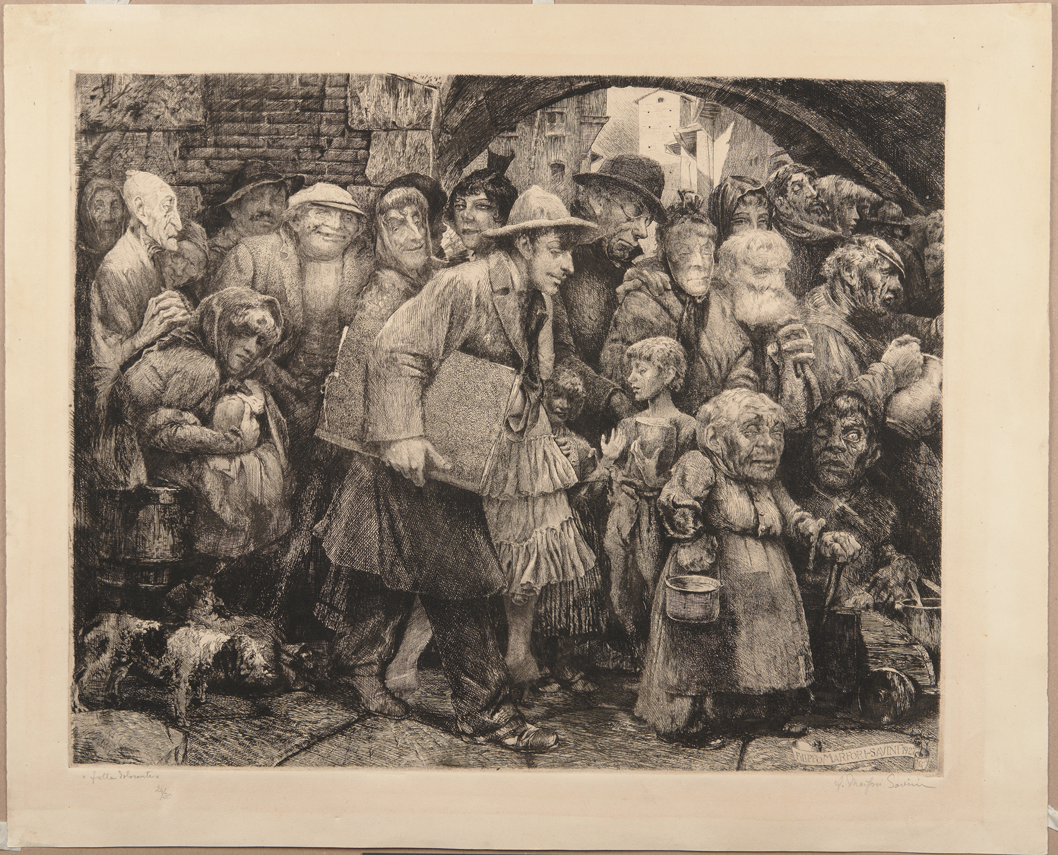 Etching, 1927. Signed and dated in the plate bottom right FILIPPO MARFORI-SAVINI 1927, titled, numbered and signed in pencil at bottom margin "folla dolorante" / 24/30 / F.Marfori Savini.