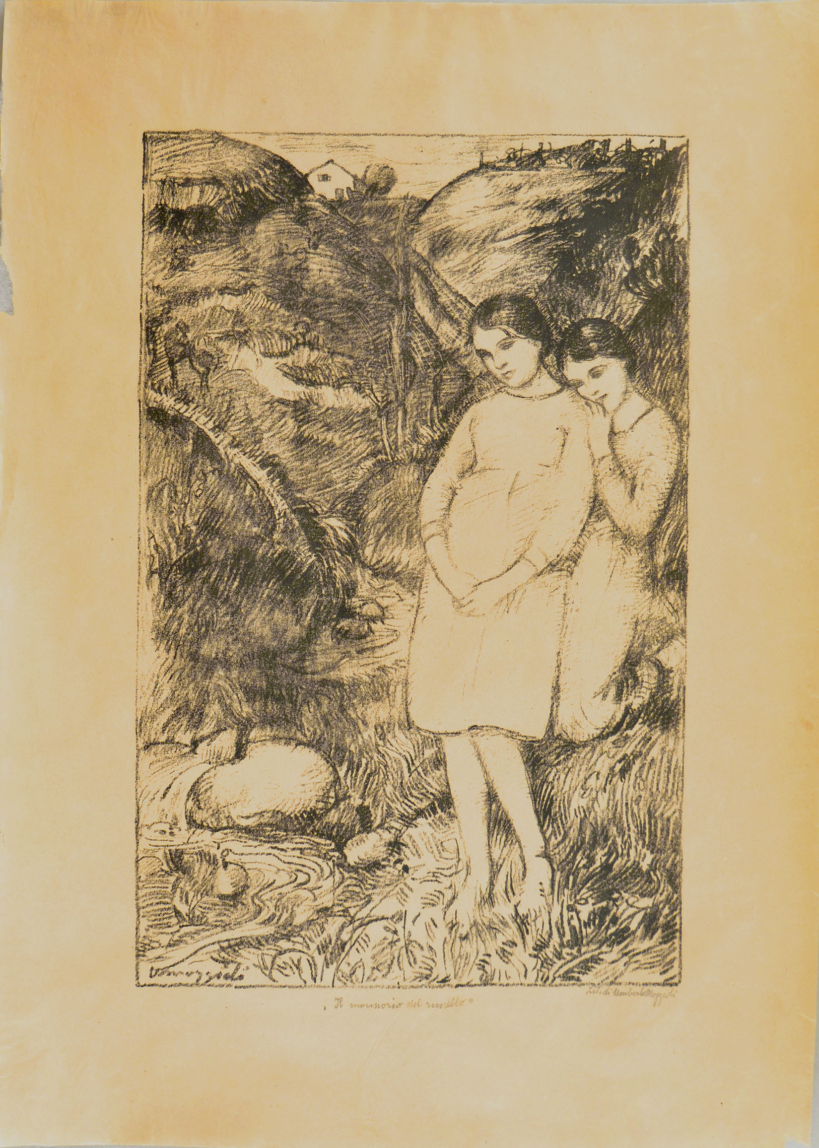 Lithograph, signed in the stone UMoggioli, titled and signed in pencil at bottom 'Il mormorio del ruscello' / lito di Umberto Moggioli. To the border line 364 x 234, the full sheet measuring 490 x 354.