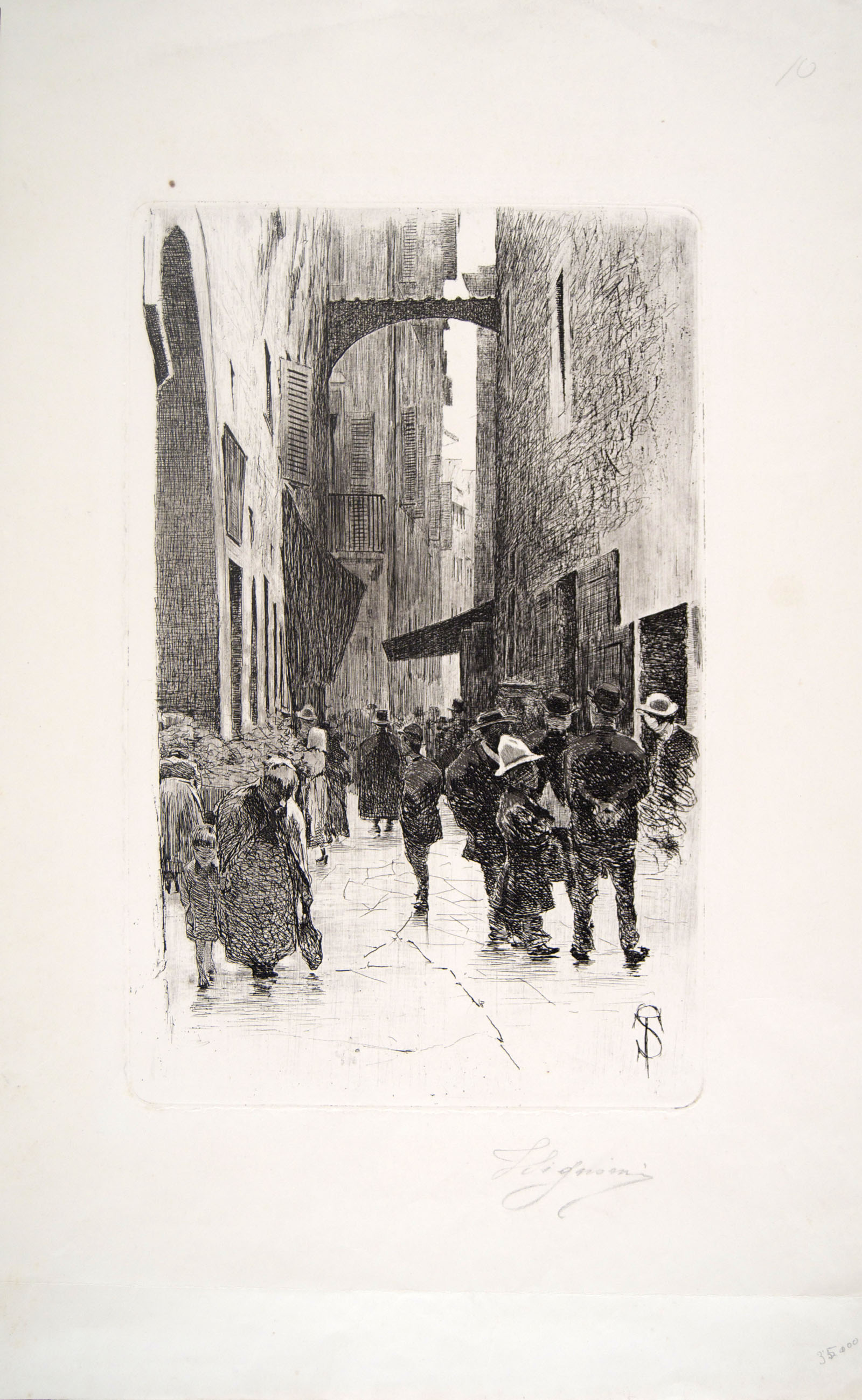 Etching, from the series devoted to the Mercato Vecchio, in Florence. Signed with monogram in the plate and signed in pencil TSignorini at the bottom margin. A fine, wiped clean impression printed in black ink on white wove paper, with full margins. Minor flaws at margins, generally in very good condition. To the platemark 368 x 234 mm, the entire sheet measuring 578 x 357 mm.