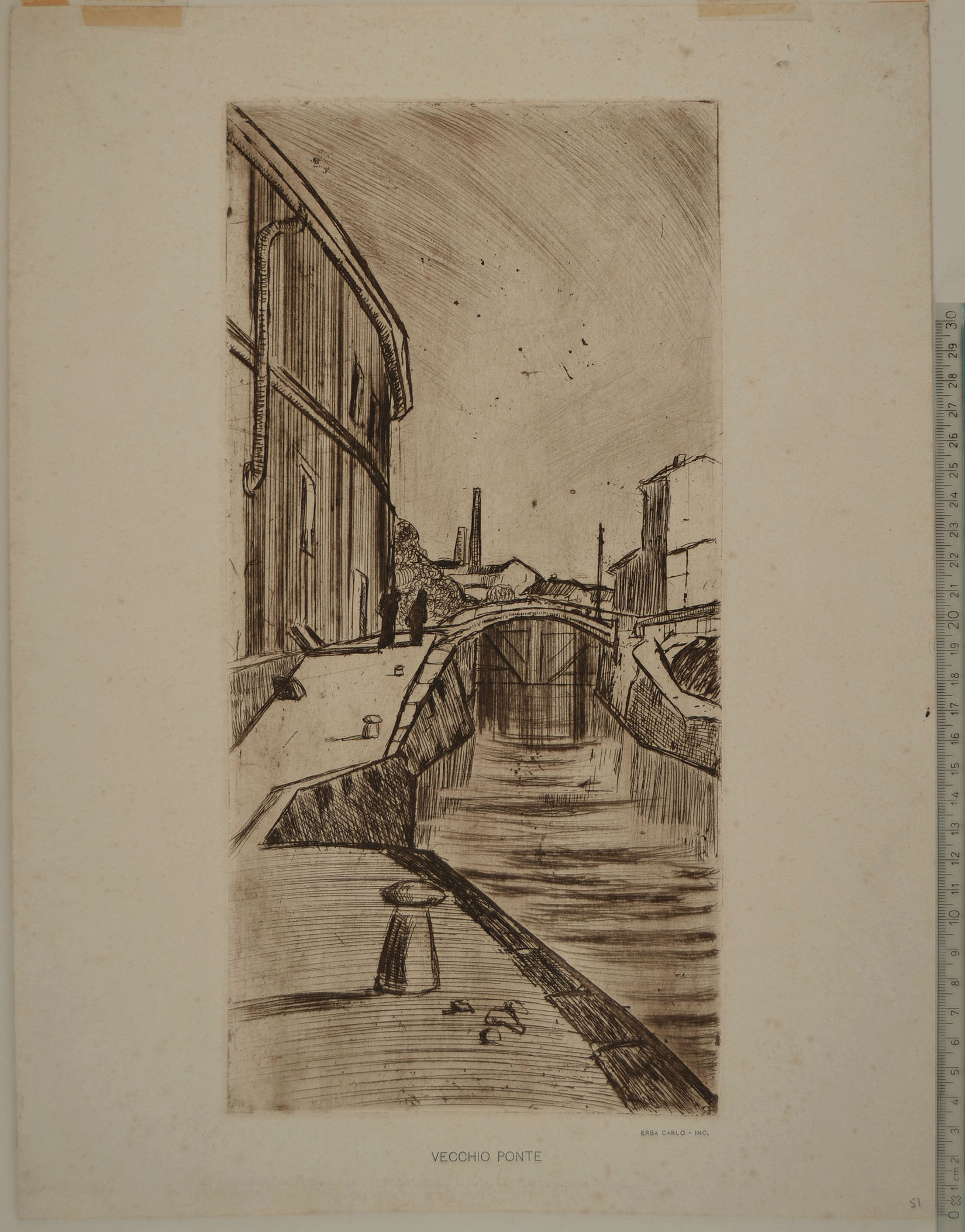 Etching; a fine impression in brownish ink on thick, white wove paper. Titled and signed typographically VECCHIO PONTE / ERBA CARLO - INC. With full margins, minor faults at the margins, generally in very good condition. To the platemark 336 x 164 mm; the full sheet measuring 404 x 308 mm. The edition of Erba's etchings titled and signed typographically is, by sure, posthumous, much probably issued by Bianca, sister of Carlo Erba, around 1944.