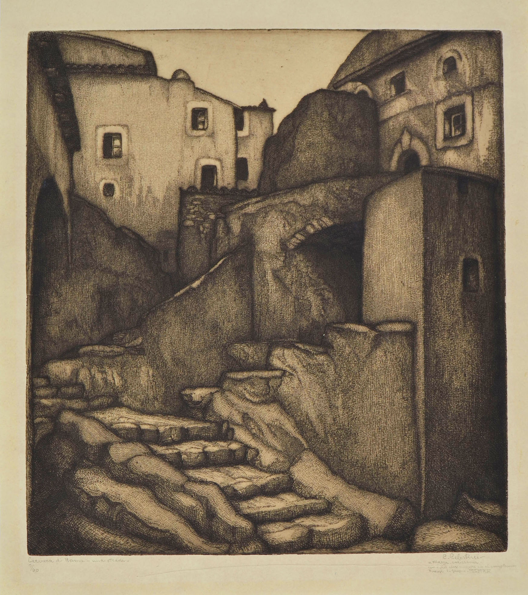 After the war, in 1919 Celestini resumed his position at the Accademia in Florence. The following year he founded the journal Calcografia and opened a workshop for printing etchings in Florence. Celestini quickly achieved an international reputation for his etchings, being elected to membership of the Chicago Society of Etchers and of the Society of the Salon d'Automne in 1921, and of the Paris based Société Internationale de la Gravure Originale en Noir in 1922. He exhibited regularly in Paris, where he was given several one-man shows. Celestini's 1929 etchings of Brittany belong to the world of Meryon and D.Y. Cameron. That year he founded a school of stage design at the Accademia dei Fidenti in Florence. In the 1930s Celestini was much employed in stage design throughout Italy, while continuing to make prints. London's Brook Street Gallery gave him an exhibition in 1933. Both in his theatrical work and in the compositions of his prints he was indebted to Gordon Craig, the English stage designer and woodblock printmaker, who had worked in Florence at the invitation of Eleonora Duse from 1906, where in 1908 he founded the journal The Mask. From the early 1930s Celestini regularly spent his summers in Anticoli Corrado, south of Rome, a resort often frequented by British and German representational printmakers. His favourite subjects for his etchings were the hill towns of central Italy with their mediaeval buildings huddling together and clinging uncertainly to the precipitous slopes. These townscapes are deserted and their dour appearance is enhanced by the gloomy lighting. Celestini also made lithographs. Unlike most of the other artists in this exhibition the fame of his prints has completely eclipsed his pictures. Celestini painted landscapes and still lives as well as the mediaeval buildings familiar from his etchings.
