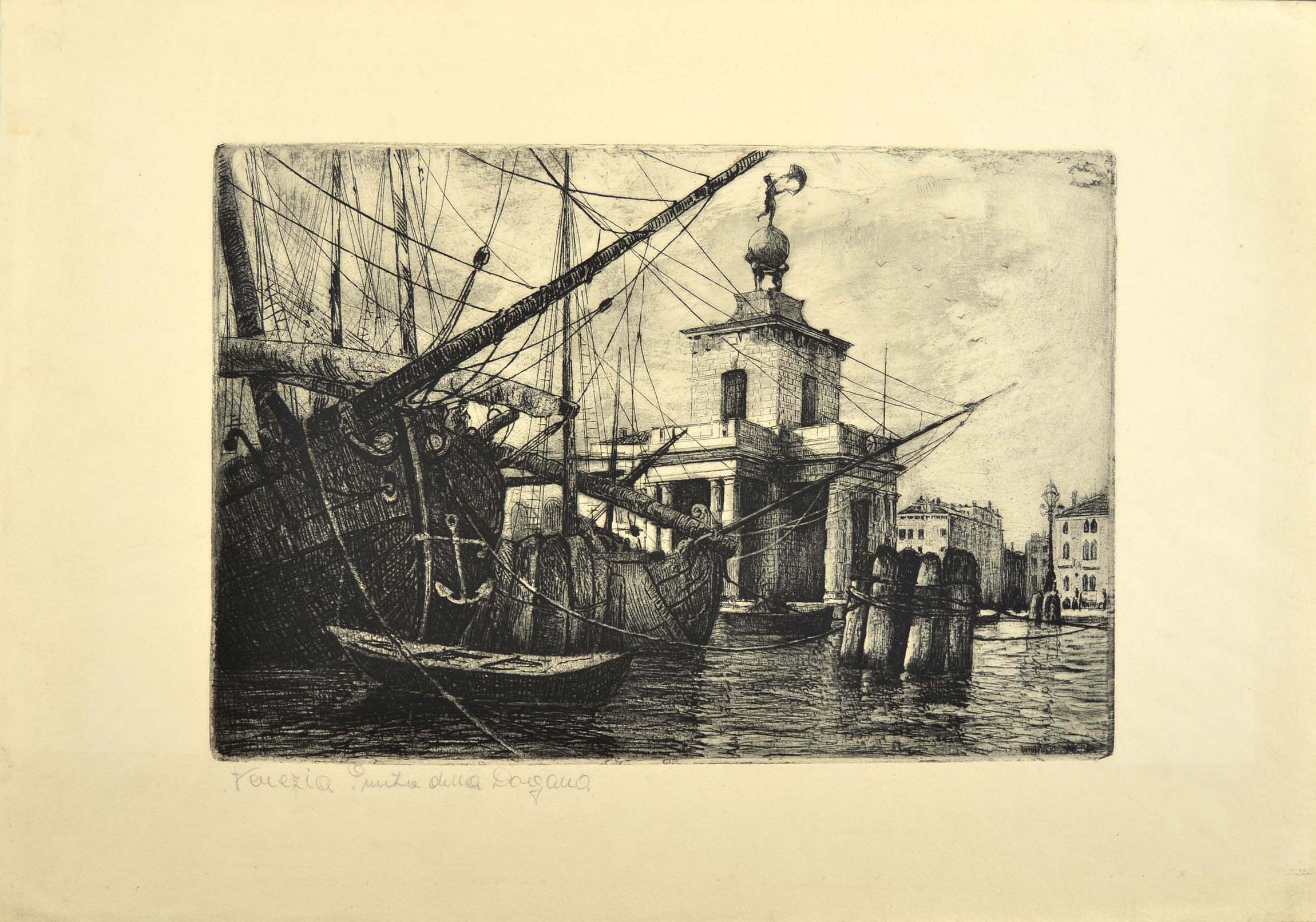 Etching. Signed in the plate at bottom right corner N 19 VENEZIA GB. Titled in pencil at bottom left Venezia Punta della Dogana.