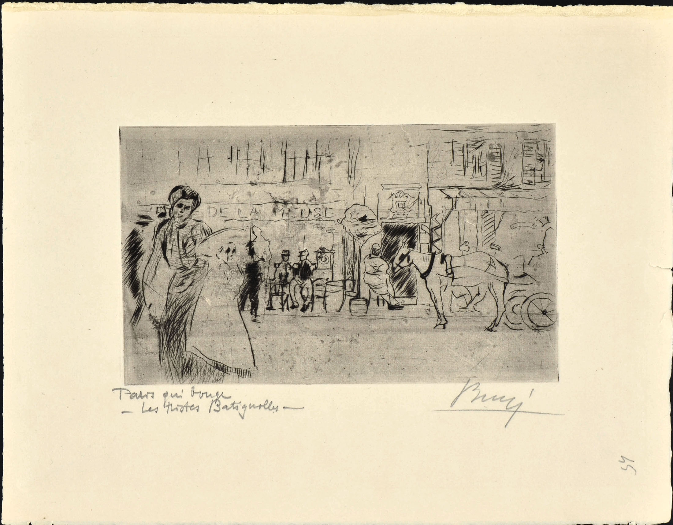 Drypoint, from the series Paris qui Bouge. Titled and signed in pencil at bottom Paris qui bouge / _ Les tristes Batignolles_ / Bucci. Fine impression on laid paper, with full margins. Minimal tear on the left margin. To the platemark 126 x 211 mm, the full sheet 250 x 325.